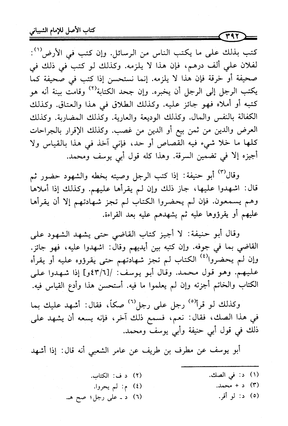 كتب بذلك على ما يكتب الناس من الرسائل. وإن كتب في الأرض (¬1): لفلان علي ألف درهم، فإن هذا لا يلزمه. وكذلك لو كتب في ذلك في صحيفة أو خرقة فإن هذا لا يلزمه. إنما نسستحسن إذا كتب في صحيفة كما يكتب الرجل إلى الرجل أن يخبره. وإن جحد الكتابة (¬2) وقامت بينة أنه هو كتبه أو أملاه دنهو جائز عليه. وكذلك الطلاق في هذا والعتاق. وكذلك الكفالة بالنفس والمال. وكذلك الوديعة والعارية. وكذلك المضاربة. وكذلك العرض والدين من ثمن بيع أو الدين من غصب. وكدلك الإقرار بالجراحات كلها ما خلا شيء فيه القصاص أو حد، فإني آخذ في هذا بالقياس ولا أجيزه إلا في تضمين السرقة. وهذا كله قول أبي يوسف ومحمد.