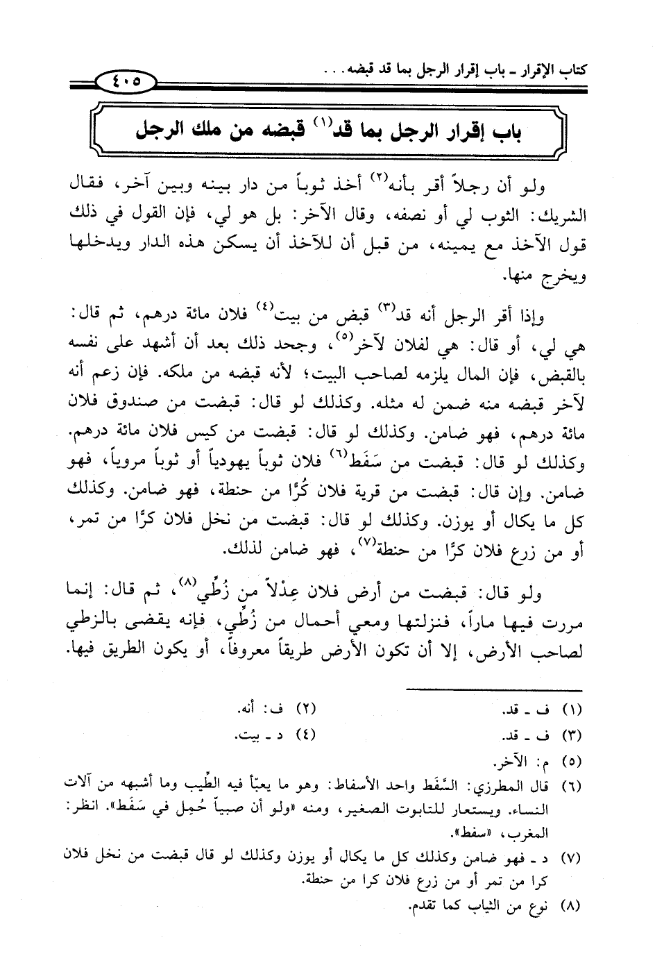 وإذا أقر الرجل أنه قد (¬3) قبض من بيت (¬4) فلان مائهة درهم، ثم قال: هي لي، أو قال: هي لفلان لآخر (¬5)، وجحد ذلك بعد أن أشهد على نفسه بالقبض، فإن المال يلزمه لصاحب البيت؛ لأنه قبضه من ملكه. فإن زعم أنه لآخر قبضمه منه ضعمن لى مثله. وكذلك لو قال: قبضت من صندوق فلان مائة درهم، فهو ضامن. وكذلك لو قال: قبضت من كيس فلان مائة درهم. وكذلك لو قال: قبضت من سَفَط (¬6) فلان ثوباً يهودياً أو ثوباً مروياً، فهو ضامن. وإن قال: قبضت من قرية فلان كُرًّا من حنطة، فهو ضامن. وكذلك كل ما يكال أو يوزن. وكذلك لو قال، قبضت من نخل فلان كرًّا من تمر، أو من زرع فلان كرًّا من حنطة (¬7)، فهو ضامن لذلك.