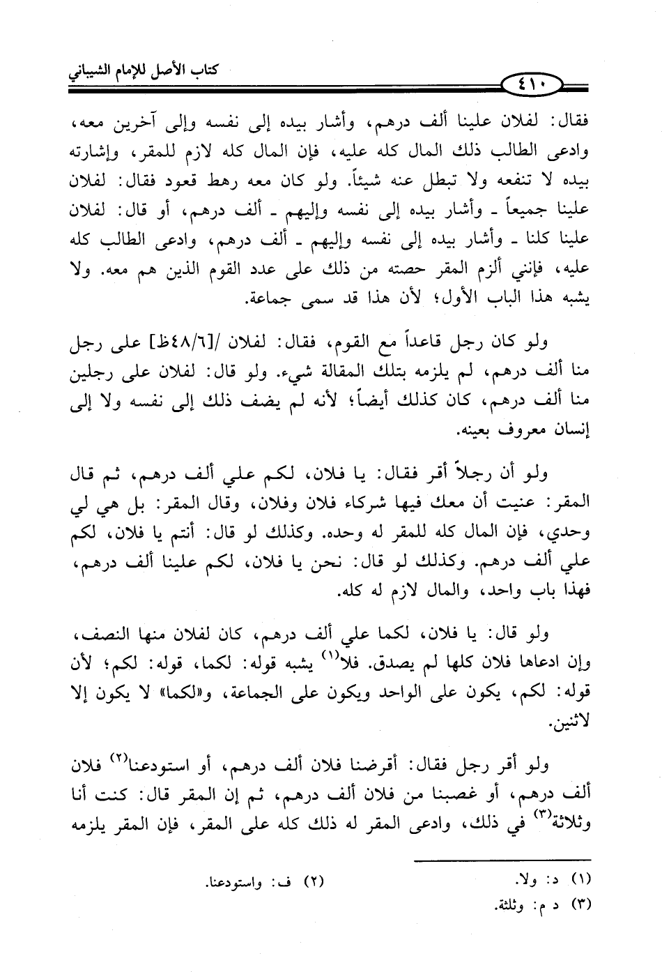 فقال: لفلان علينا ألف درهم، وأشار بيده إلى نفسه وإلى آخرين معه، وادعى الطالب ذلك المال كله عليه، فإن المال كله لازم للمقر، وإشارته بيده لا تنفعه ولا تبطل عنه شيئاً. ولو كان معه رهط قعود فقال: لفلان علينا جميعاً - وأشار بيده إلى نفسه وإليهم - ألف درهم، أو قال: لفلان علينا كلنا- وأشار بيده إلى نفسه واليهم - ألف درهم، وادعى الطالب كله عليه، فإنني ألزم المقر حصته من ذلك على عدد القوم الذين هم معه. ولا يشبه هذا الباب الأول؛ لأن هذا قد سمى جماعة.