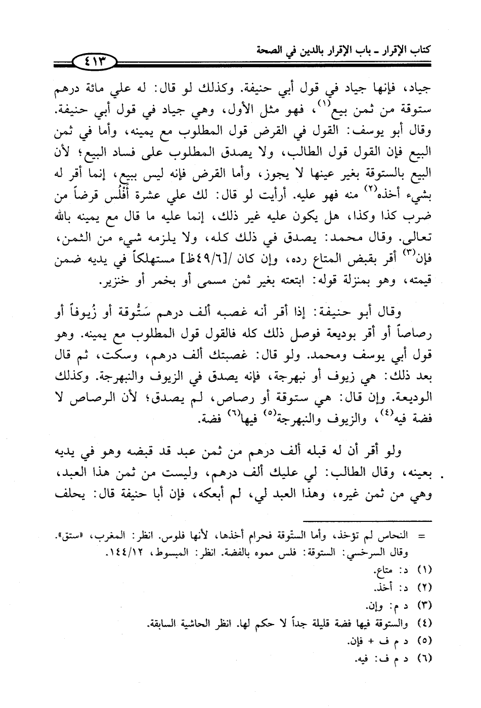 وقال أبو حنيفة: إذا أقر أنه غصبه ألف درهم سَتُّوقة أو زُيوفاً أو رصاصاً أو أقر بوديعة فوصل ذلك كله فالقول دول المطلوب مع يمينه. وهو قول أبي يوسف ومحمد. ولو قال: غصبتك ألف درهم، وسكت، ثم قال بعد ذلك: هي زيوف أو نبهرجة، فإنه يصدق في الزيوف والنبهرجة. وكذلك الوديعة. وإن قال: هي ستوقة أو رصاص، لم يصدق؛ لأن الرصاص لا فضة فيه (¬4)، والزيوف والنبهرجة (¬5) فيها (¬6) فضة.