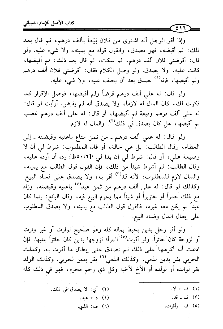ولو قال: له علي أسلف درهم قرضاً ولم أقبضها، فوصل الإقرار كما ذكرت لك، كان المال له لازماً، ولا يصدق أنه لم يقبض. أرأيت لو قال: له علي ألف درهم وديعة لم أقبضها، أو قال: له علي ألف درهم غصب لم أقبضها، هل كان يصدق في ذلك (¬2). والمال له لازم.