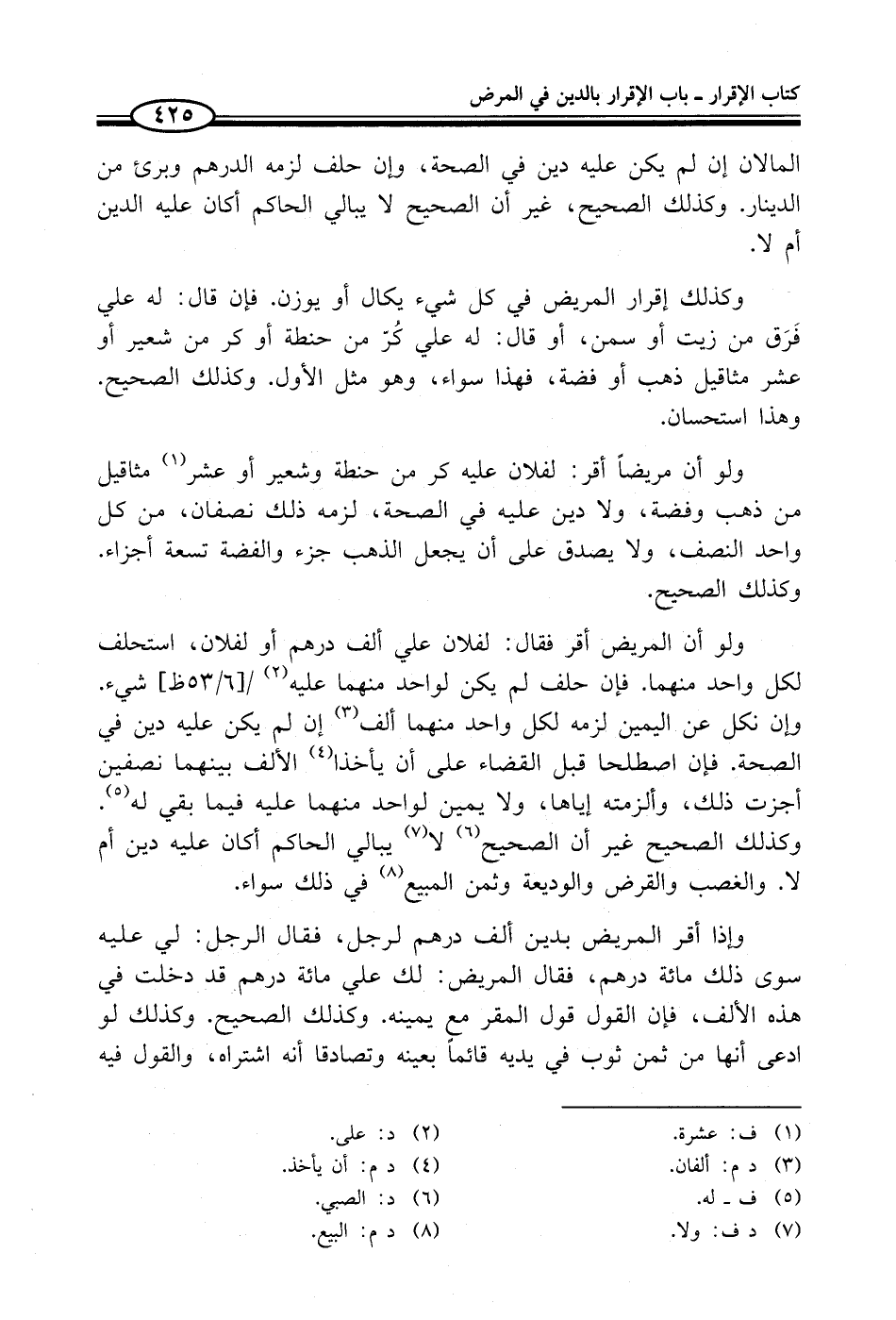 وكذلك إقرار المريض في كل شيء يكال أو يوزن. فإن قال: له علي فَرَق من زيت أو سمن، أو قال: له علي كُرّ من حنطة أو كر من شعير أو عشر مثاقيل ذهب أو فضة، فهذا سواء، وهو مثل الأول. وكذلك الصحيح. وهذا استحسان.