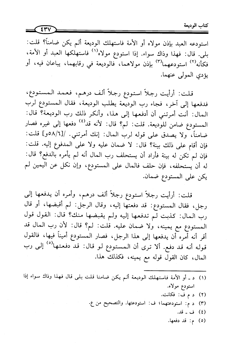 (¬1) د - أو الأمة فاستهلك الوديعة ألم يكن ضامنا قلت بلى قال فهذا وذاك سواء إذا استودع مولاه.