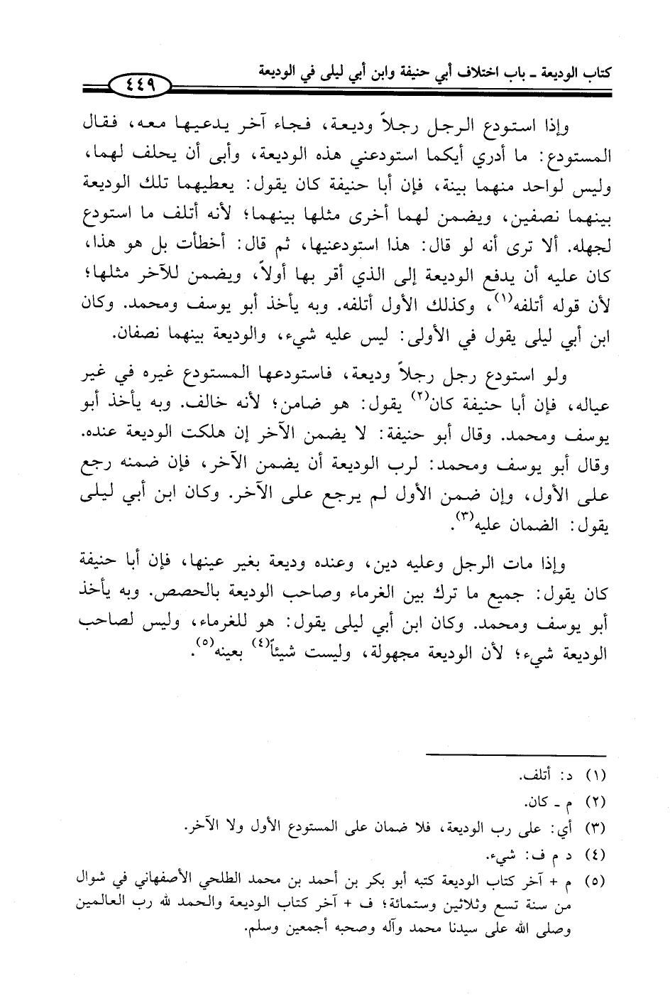 (¬5) م + آخر كتاب الوديعة كتبه أبو بكر بن أحمد بن محمد الطلحي الأصفهاني في شوال من سنة تسع وثلاثين وستمائة؛ ف + آخر كتاب الوديعة والحمد لله رب العالمين وصلى الله على سيدنا محمد وآله وصحبه أجمعين وسلم.