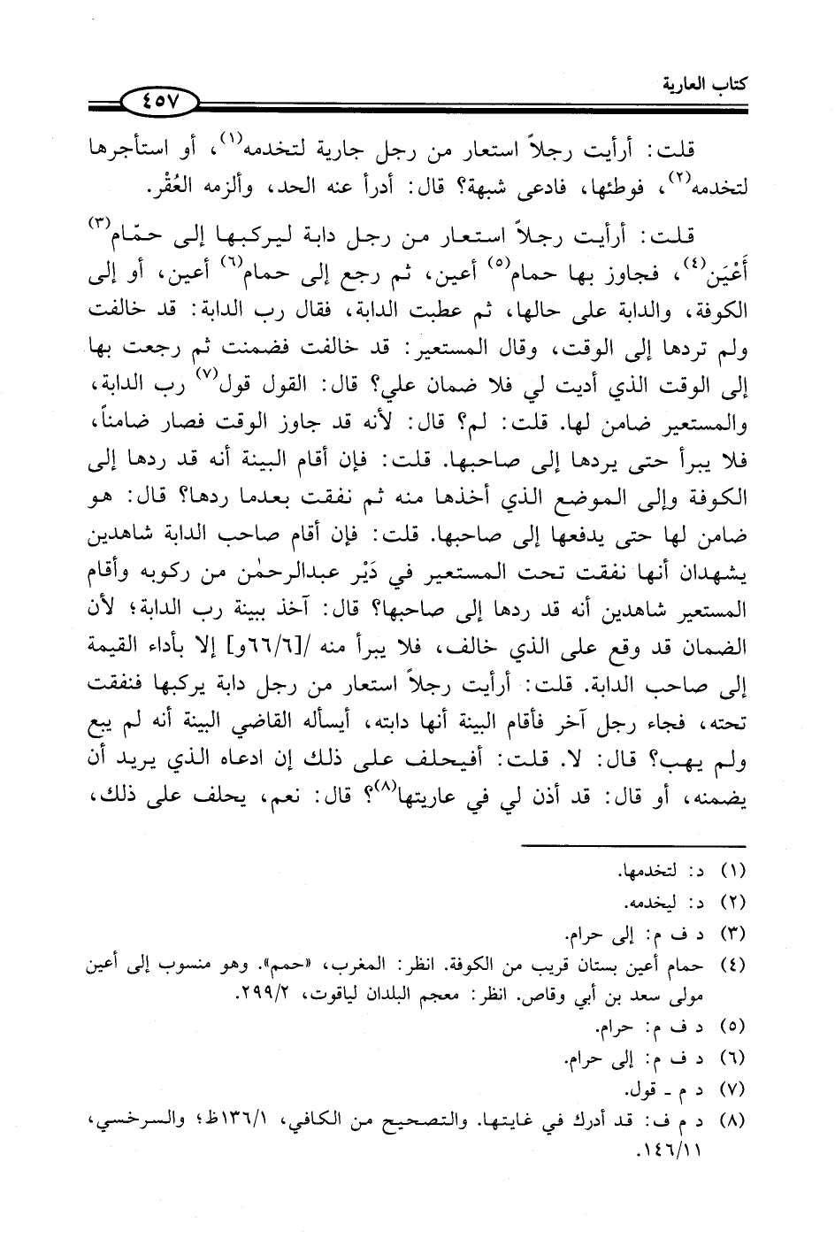 قلت: أرأيت رجلاً استعار من رجل دابة ليركبها إلى حمّام (¬3) أَعْيَن (¬4)، فجاوز بها حمام (¬5) أعين، ثم رجع إلى حمام (¬6) أعين، أو إلى الكوفة، والدابة على حالها، ثم عطبت الدابة، فقال رب الدابة: قد خالفت ولم تردها إلى الوقت، وقال المستعير: قد خالفت فضمنت ثم رجعت بها إلى الوقت الذي أديت لي فلا ضمان علي؟ قال: القول قول (¬7) رب الدابة، والمستعير ضامن لها. قلت: لم؟ قال: لأنه قد جاوز الوقت فصار ضامناً، فلا يبرأ حتى يردها إلى صاحبها. قلت: فإن أقام البينة أنه قد ردها إلى الكوفة وإلى الموضع الذي أخذها منه ثم نفقت بعدما ردها؟ قال: هو ضامن لها حتى يدفعها إلى صاحبها. قلت: فإن أقام صاحب الدابة شاهدين يشهدان أنها نفقت تحت المستعير في دَيْر عبد الرحمن من ركوبه وأقام المستعير شاهدين أنه قد ردها إلى صاحبها؟ قال: آخذ ببينة رب الدابة؛ لأن الضمان قد وقع على الذي خالف، فلا يبرأ منه إلا بأداء القيمة إلى صاحب الدابة. قلت: أرأيت رجلاً استعار من رجل دابة يركبها فنفقت تحته، فجاء رجل آخر فأقام البينة أنها دابته، أيسأله القاضي البينة أنه لم يبع ولم يهب؟ قال: لا. قلت: أفيحلف على ذلك إن ادعاه الذي يريد أن يضمنه، أو قال: قد أذن لي في عاريتها (¬8)؟ قال: نعم، يحلف على ذلك،