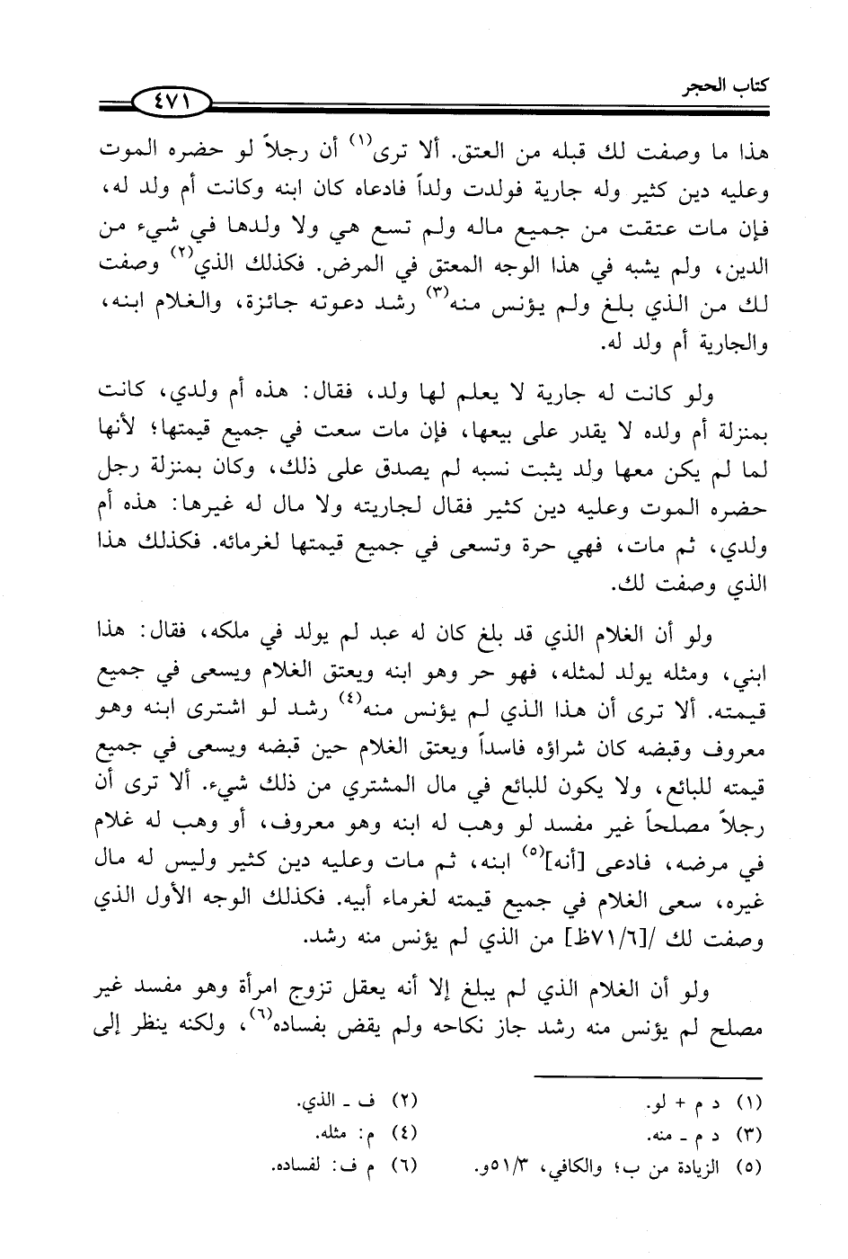 هذا ما وصفت لك قبله من العتق. ألا ترى (¬1) أن رجلاً لو حضره الموت وعليه دين كثير وله جارية فولدت ولداً فادعاه كان ابنه وكانت أم ولد له، فإن مات عتقت من جميع ماله ولم تسع هي ولا ولدها في شيء من الدين، ولم يشبه في هذا الوجه المعتق في المرض. فكذلك الذي (¬2) وصفت لك من الذي بلغ ولم يؤنس منه (¬3) رشد دعوته جائزة، والغلام ابنه، والجارية أم ولد له.