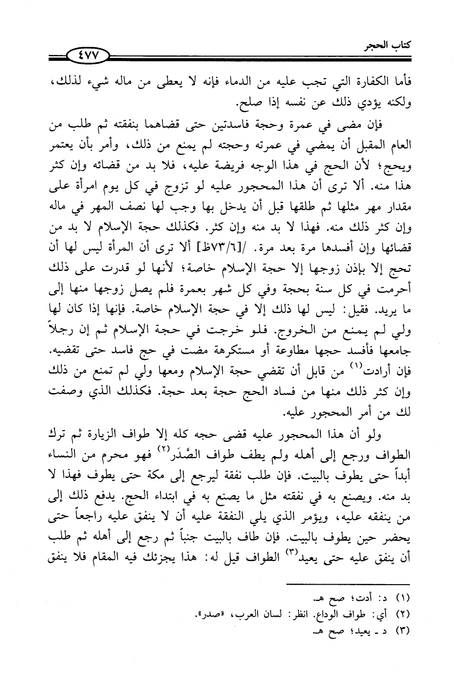 ولو أن هذا المحجور عليه قضى حجه كله إلا طواف الزيارة ثم ترك الطواف ورجع إلى أهله ولم يطف طواف الصَّدَر (¬2) فهو محرم من النساء أبداً حتى يطوف بالبيت. فإن طلب نفقة ليرجع إلى مكة حتى يطوف فهذا لا بد منه. ويصنع به في نفقته مثل ما يصنع به في ابتداء الحج. يدفع ذلك إلى من ينفقه عليه، ويؤمر الذي يلي النفقة عليه أن لا لنفق عليه راجعاً حتى يحضر حين يطوف بالبيت. فإن طاف بالبيت جنباً ثم رجع إلى أهله ثم طلب أن ينفق عليه حتى يعيد (¬3) الطواف قيل له: هذا يجزئك فيه المقام فلا ينفق