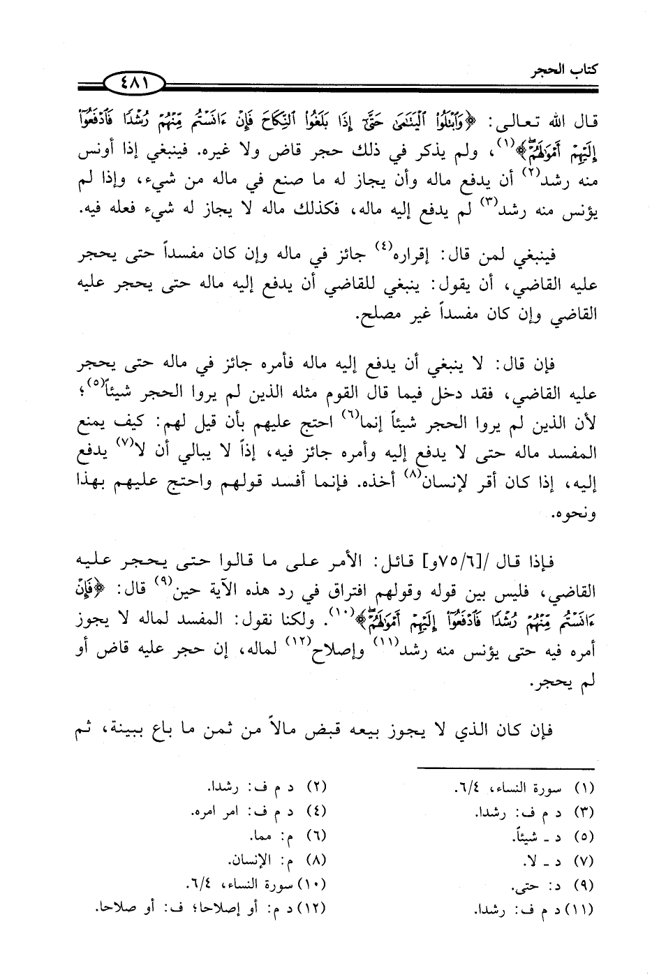 فإذا قال قائل: الأمر على ما قالوا حتى يحجر عليه القاضي، فليس بين قوله وقولهم افتراق في رد هذه الآية حين (¬9) قال: {فَإِنْ آنَسْتُمْ مِنْهُمْ رُشْدًا فَادْفَعُوا إِلَيْهِمْ أَمْوَالَهُمْ} (¬10). ولكنا نقول: المفسد لماله لا يجوز أمره فيه حتى يؤنس منه رشد (¬11) وإصلاح (¬12) لماله، إن حجر عليه قاض أو لم يحجر.