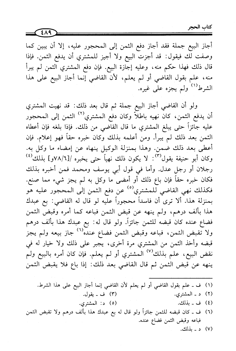 أجاز البيع جملة فقد أجاز دفع الثمن إلى المحجور عليه، إلا أن يبين كما وصفت لك فيقول: قد أجزت البيع ولا أجيز للمشتري أن يدفع الثمن. فإذا قال ذلك فهذا حكم منه، وعليه إجازة البيع. فإن دفع المشتري الثمن لم يبرأ منه، علم بقول القاضي أو لم يعلم، لأن القاضي إنما أجاز البيع على هذا الشرط (¬1) ولم يجزه على غيره.