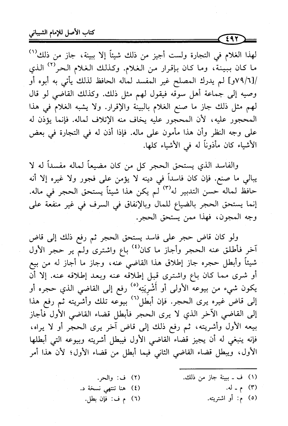 ولو كان قاض حجر على فاسد يستحق الحجر ثم رفع ذلك إلى قاض آخر فأطلق عنه الحجر وأجاز ما كان (¬4) باع واشترى ولم ير حجر الأول شيئاً وأبطل حجره جاز إطلاق هذا القاضي عنه، وجاز ما أجاز له من بيع أو شرى مما كان باع واشترى قبل إطلاقه عنه وبعد إطلاقه عنه. إلا أن يكون شيء من بيوعه الأولى أو أَشْرِيَتِه (¬5) رفع إلى القاضي الذي حجره أو إلى قاض غيره يرى الحجر. فإن أبطل (¬6) بيوعه تلك وأشريته ثم رفع هذا إلى القاضي الآخر الذي لا يرى الحجر فأبطل قضاء القاضي الأول فأجاز بيعه الأول وأشريته، ثم رفع ذلك إلى قاض آخر يرى الحجر أو لا يراه، فإنه ينبغي له أن يجيز قضاء القاضي الأول فيبطل أشريته وبيوعه التي أبطلها الأول، ويبطل قضاء القاضي الثاني فيما أبطل من قضاء الأول؛ لأن هذا أمر