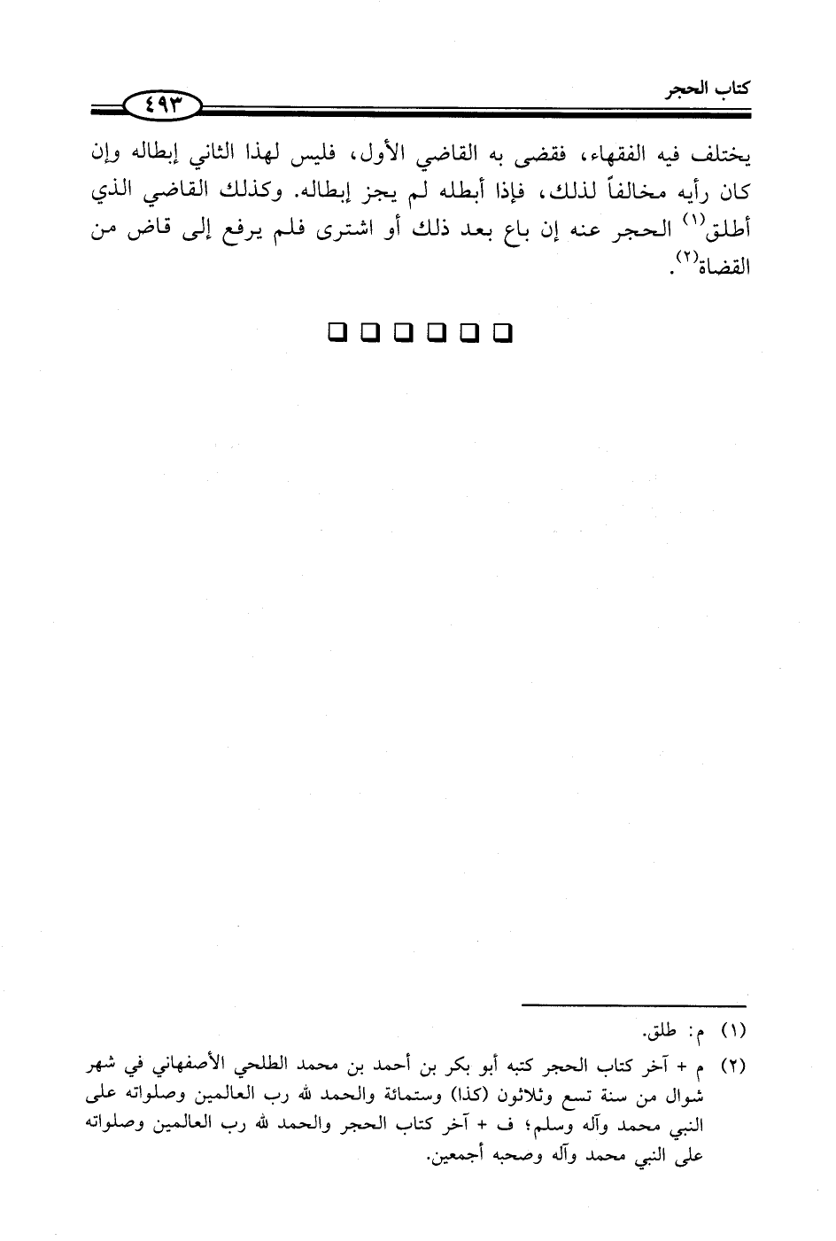 (¬2) م + آخر كتاب الحجر كتبه أبو بكر بن أحمد بن محمد الطلحي الأصفهاني في شهر شوال من سنة تسع وثلاثون (كذا) وستمائة والحمد لله رب العالمين وصلواته على النبي محمد وآله وسلم؛ ف + آخر كتاب الحجر والحمد لله رب العالمين وصلواته على النبي محمد وآله وصحبه أجمعين.