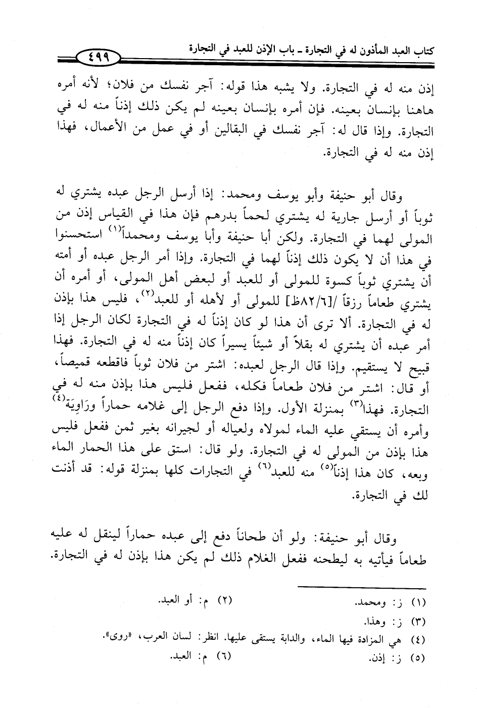 وقال أبو حنيفة وأبو يوسف ومحمد: إذا أرسل الرجل عبده يشتري له ثوباً أو أرسل جارية له يشتري لحماً بدرهم فإن هذا في القياس إذن من المولى لهما في التجارة. ولكن أبا حنيفة وأبا يوسف ومحمداً (¬1) استحسنوا في هذا أن لا يكون ذلك إذناً لهما في التجارة. وإذا أمر الرجل عبده أو أمته أن يشتري ثوباً كسوة للمولى أو للعبد أو لبعض أهل المولى، أو أمره أن يشتري طعاماً رزقاً للمولى أو لأهله أو للعبد (¬2)، فليس هذا بإذن له في التجارة. ألا ترى أن هذا لو كان إذناً له في التجارة لكان الرجل إذا أمر عبده أن يشتري له بقلاً أو شيئاً يسيراً كان إذناً منه له في التجارة. فهذا قبيح لا يستقيم. وإذا قال الرجل لعبده: اشتر من فلان ثوباً فاقطعه قميصاً، أو قال: اشتر من فلان طعاماً فكله، ففعل فليس هذا بإذن منه له في التجارة. فهذا (¬3) بمنزلة الأول. وإذا دفع الرجل إلى غلامه حماراً ورَاوِيَة (¬4) وأمره أن يستقي عليه الماء لمولاه ولعياله أو لجيرانه بغير ثمن ففعل فليس هذا بإذن من المولى له في التجارة. ولو قال: استق على هذا الحمار الماء وبعه، كان هذا إذناً (¬5) منه للعبد (¬6) في التجارات كلها بمنزلة قوله: قد أذنت لك في التجارة.