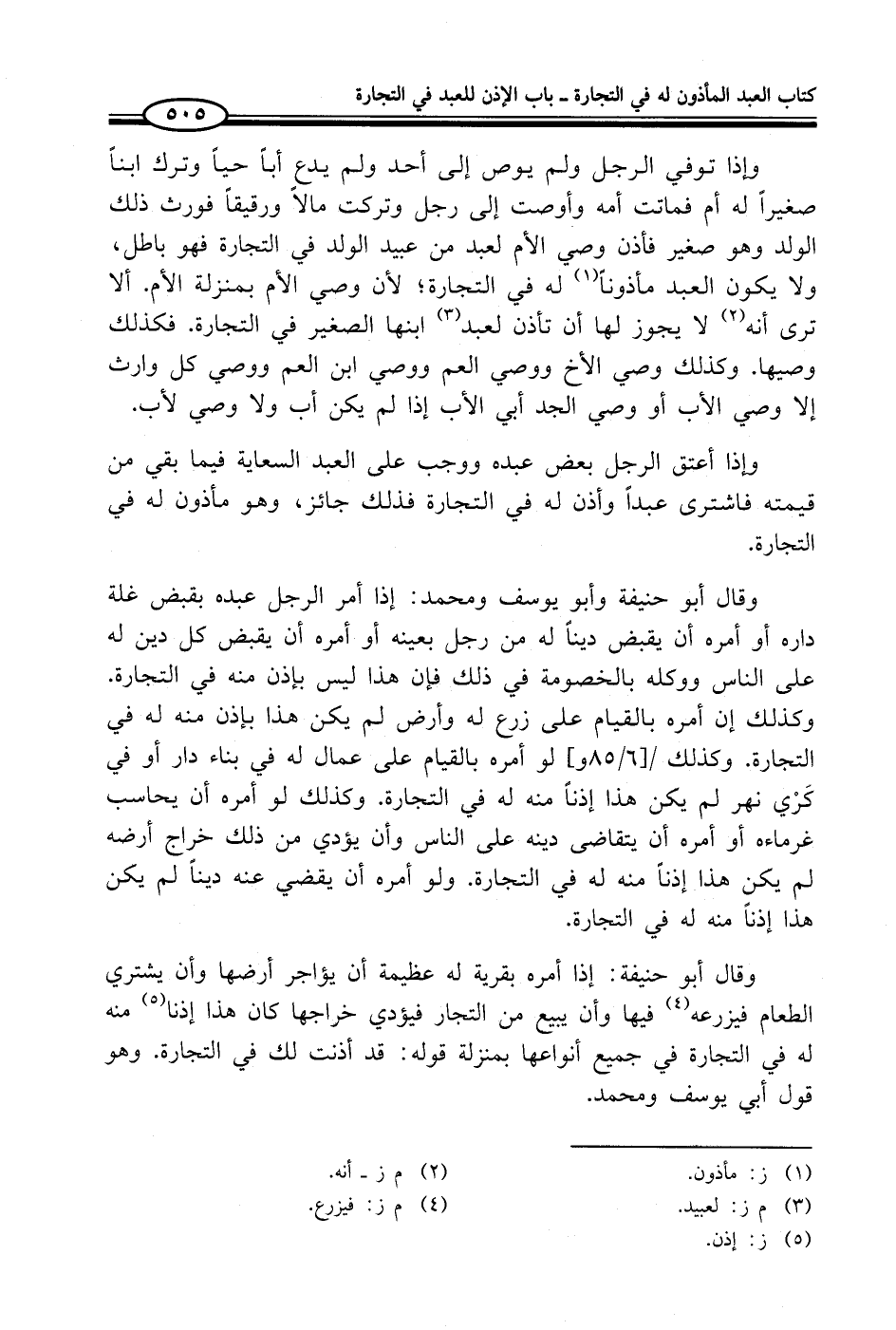 وقال أبو حنيفة: إذا أمره بقرية له عظيمة أن يؤاجر أرضها وأن يشتري الطعام فيزرعه (¬4) فيها وأن يبيع من التجار فيؤدي خراجها كان هذا إذنا (¬5) منه له في التجارة في جميع أنواعها بمنزلة قوله: قد أذنت لك في التجارة. وهو قول أبي يوسف ومحمد.