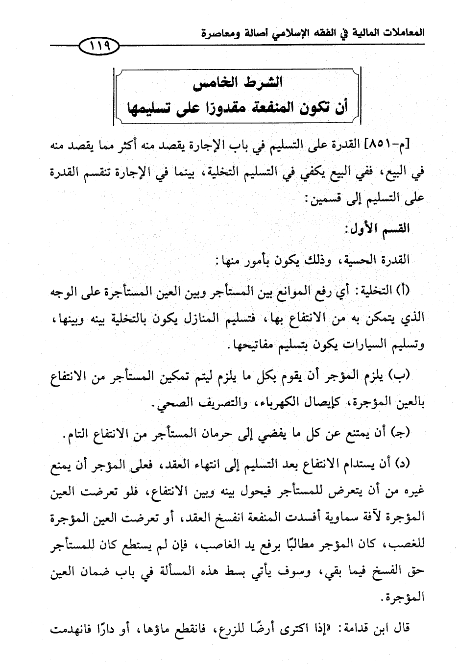 الشرط الخامس أن تكون المنفعة مقدوراً على تسليمها