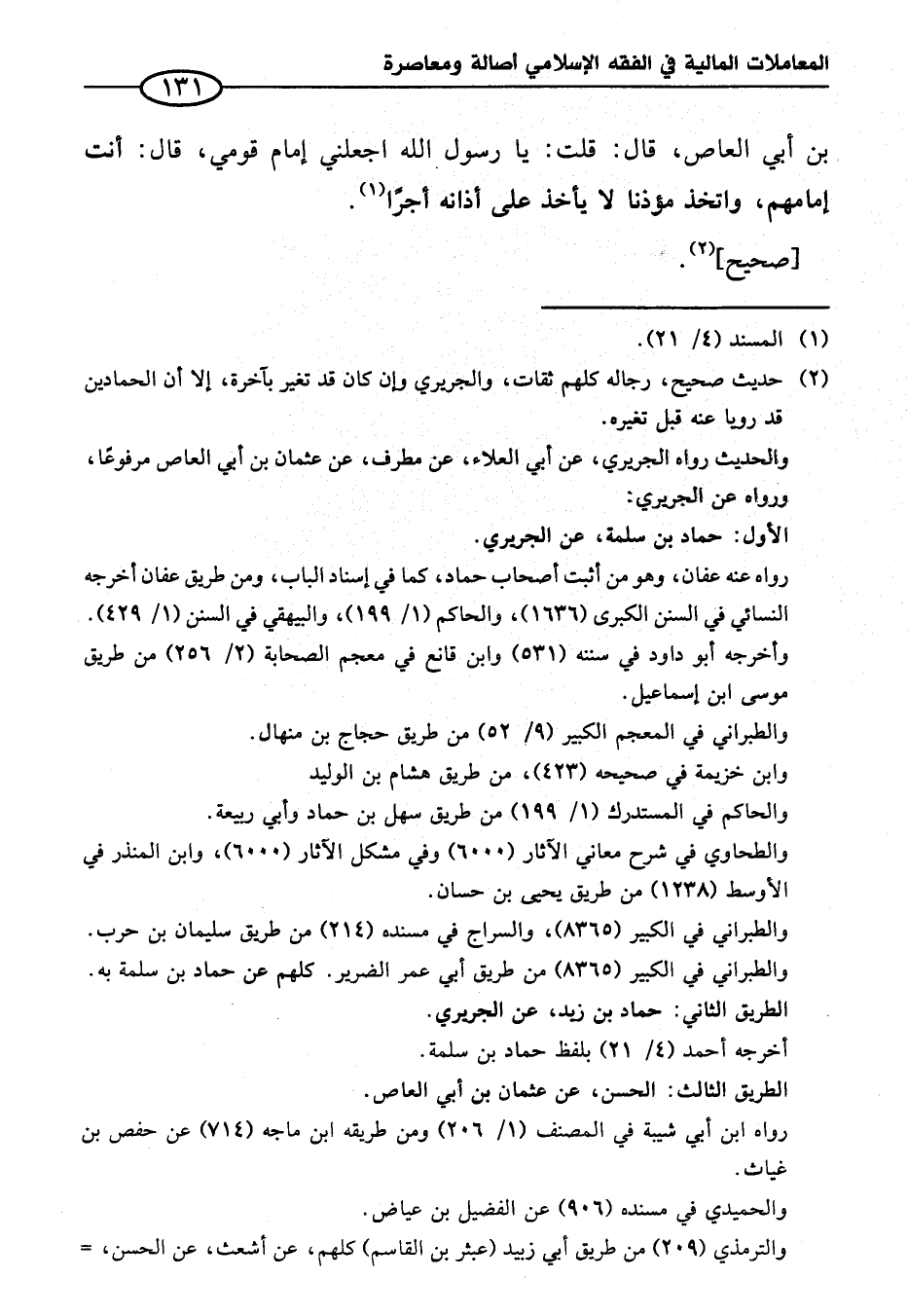 بن أبي العاص، قال: قلت: يا رسول الله اجعلني إمام قومي، قال: أنت إمامهم، واتخذ موذنا لا يأخذ على أذانه أجرًا (¬١).