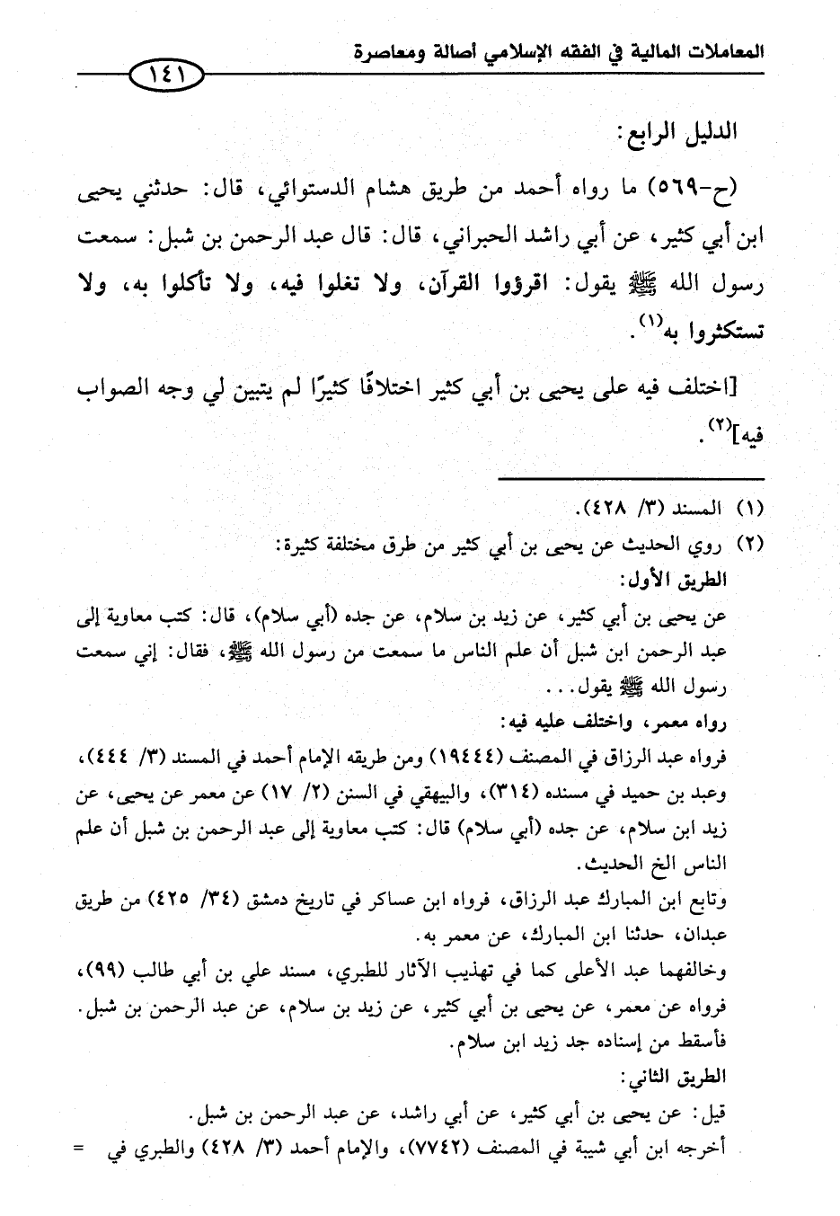 (ح-٥٦٩) ما رواه أحمد من طريق هشام الدستوائي، قال: حدثني يحيى ابن أبي كثير، عن أبي راشد الحبراني، قال: قال عبد الرحمن بن شبل: سمعت رسول الله -صلى الله عليه وسلم- يقول: اقرؤوا القرآن، ولا تغلوا فيه، ولا تأكلوا به، ولا تستكثروا به (¬١).