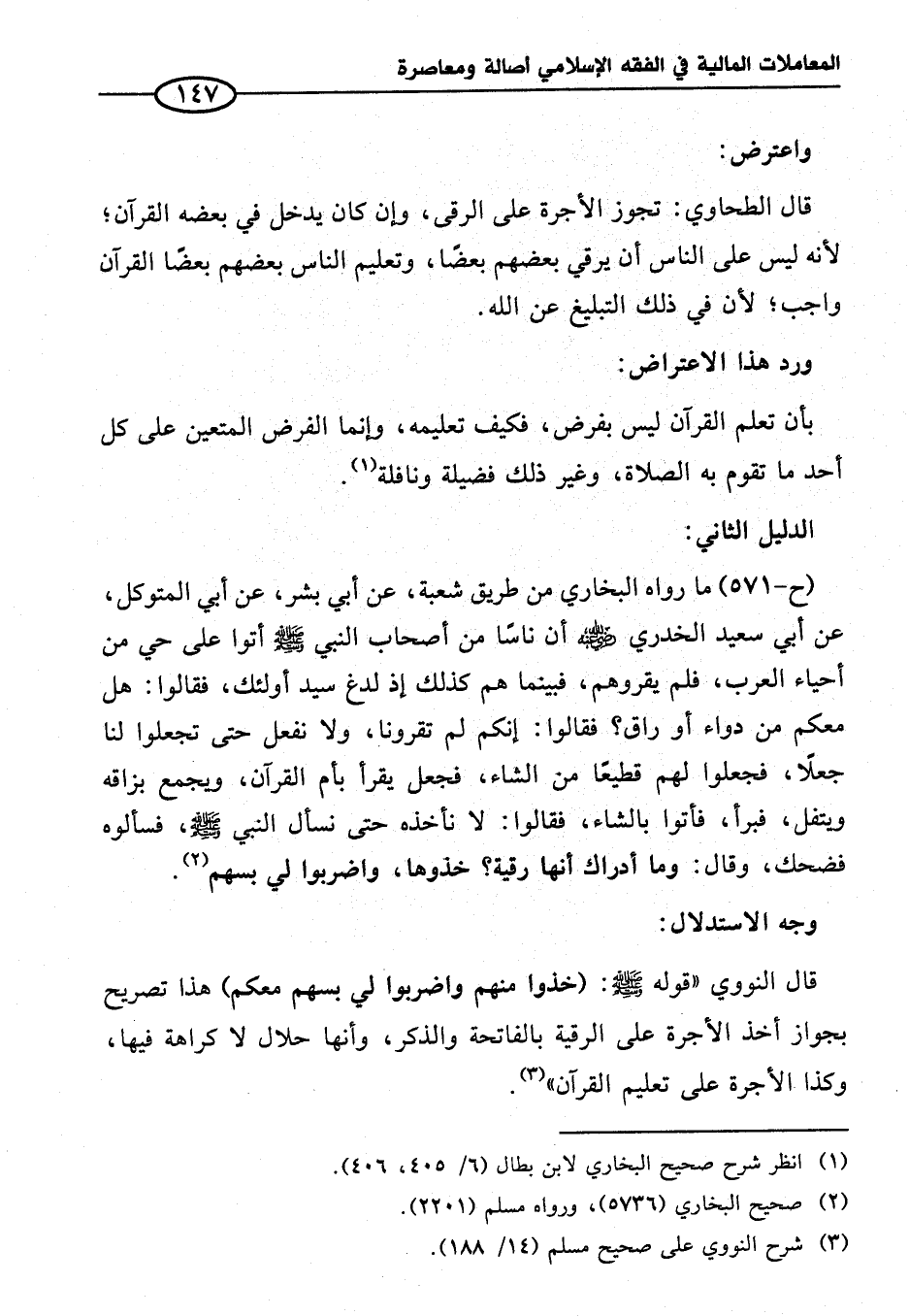 قال النوويّ "قوله - صلى الله عليه وسلم -: (خذوا منهم واضربوا لي بسهم معكم) هذا تصريح بجواز أخذ الأجرة على الرقية بالفاتحة والذكر، وأنها حلال لا كراهة فيها، وكذا الأجرة على تعليم القرآن" (¬٣).