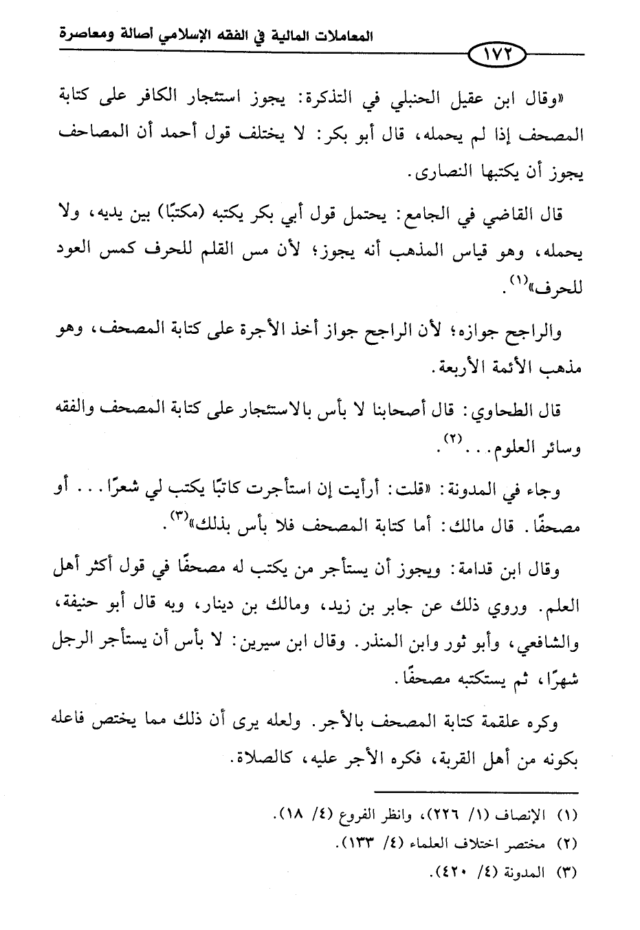 وقال ابن قدامة: ويجوز أن يستأجر من يكتب له مصحفًا في قول أكثر أهل العلم. وروي ذلك عن جابر بن زيد، ومالك بن دينار، وبه قال أبو حنيفة، والشافعي، وأبو ثور وابن المنذر. وقال ابن سيرين: لا بأس أن يستأجر الرجل شهرا، ثم يستكتبه مصحفًا.