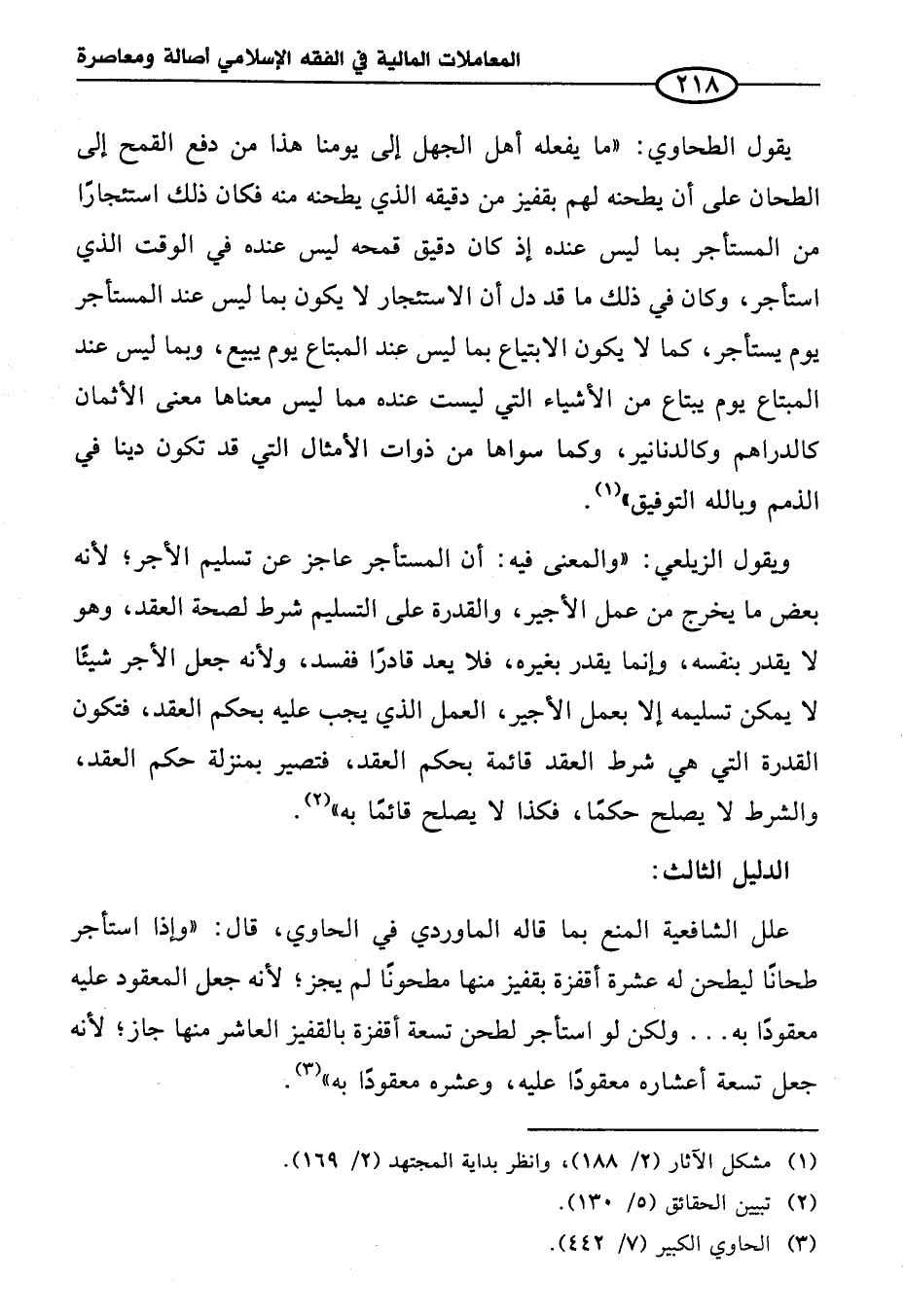 يقول الطحاوي: "ما يفعله أهل الجهل إلى يومنا هذا من دفع القمح إلى الطحان على أن يطحنه لهم بقفيز من دقيقه الذي يطحنه منه فكان ذلك استئجارًا من المستأجر بما ليس عنده إذ كان دقيق قمحه ليس عنده في الوقت الذي استأجر، وكان في ذلك ما قد دل أن الاستئجار لا يكون بما ليس عند المستأجر يوم يستأجر، كما لا يكون الابتياع بما ليس عند المبتاع يوم يبيع، وبما ليس عند المبتاع يوم يبتاع من الأشياء التي ليست عنده مما ليس معناها معنى الأثمان كالدراهم وكالدنانير، وكما سواها من ذوات الأمثال التي قد تكون دينا في الذمم وبالله التوفيق" (¬١).