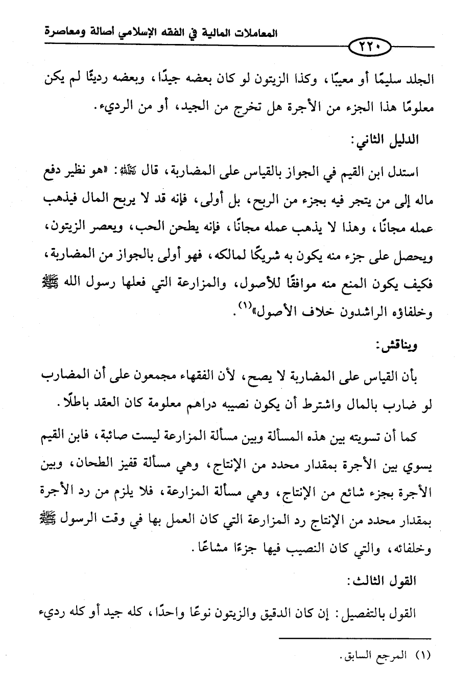 كما أن تسويته بين هذه المسألة وبين مسألة المزارعة ليست صائبة، فابن القيم يسوي بين الأجرة بمقدار محدد من الإنتاج، وهي مسألة قفيز الطحان، وبين الأجرة بجزء شائع من الإنتاج، وهي مسألة المزارعة، فلا يلزم من رد الأجرة بمقدار محدد من الإنتاج رد المزارعة التي كان العمل بها في وقت الرسول - صلى الله عليه وسلم - وخلفائه، والتي كان النصيب فيها جزءًا مشاعًا.