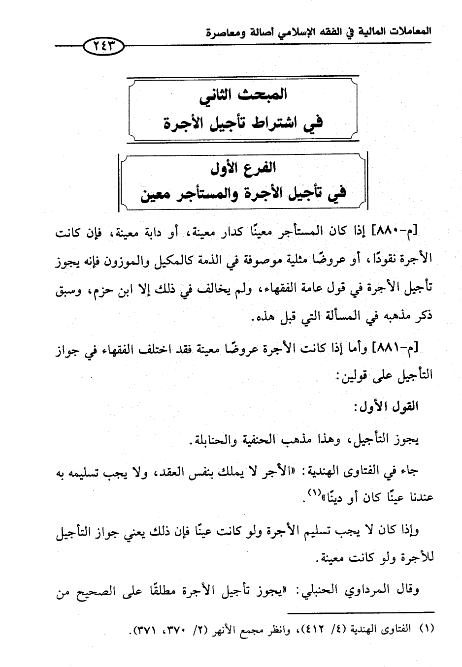 [م - ٨٨٠] إذا كان المستأجر معينًا كدار معينة، أو دابة معينة، فإن كانت الأجرة نقودًا، أو عروضًا مثلية موصوفة في الذمة كالمكيل والموزون فإنه يجوز تأجيل الأجرة في قول عامة الفقهاء، ولم يخالف في ذلك إلا ابن حزم، وسبق ذكر مذهبه في المسألة التي قبل هذه.