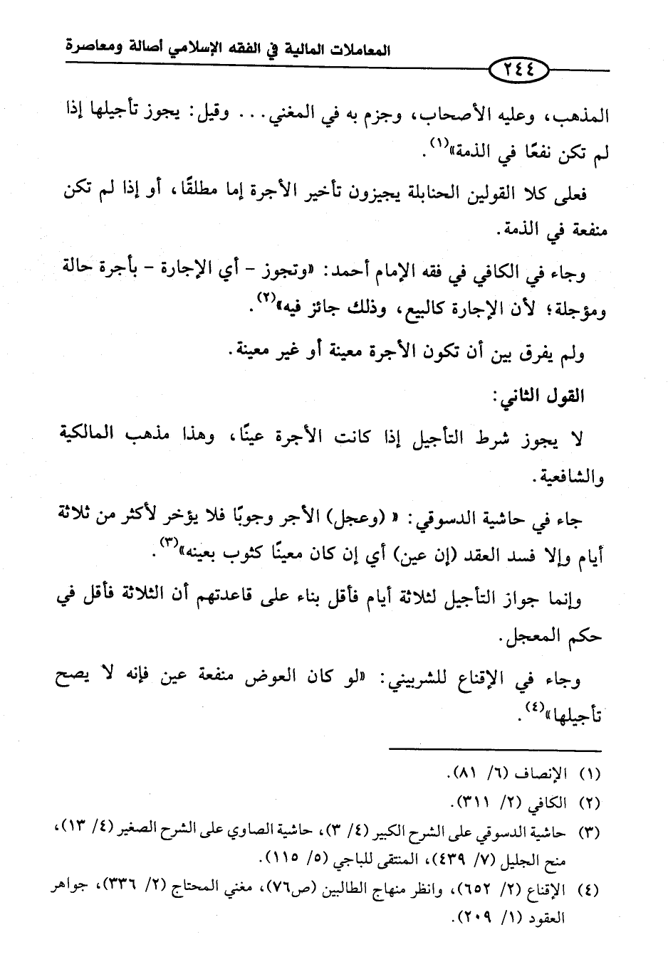 وجاء في الإقناع للشربيني: "لو كان العوض منفعة عين فإنه لا يصح تأجيلها" (¬٤).