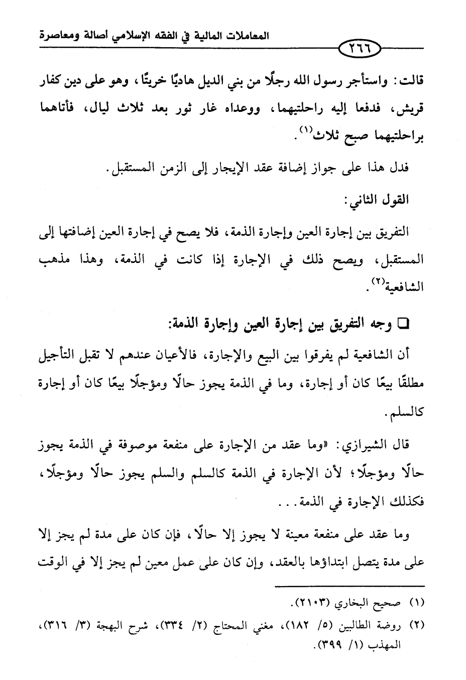التفريق بين إجارة العين وإجارة الذمة، فلا يصح في إجارة العين إضافتها إلى المستقبل، ويصح ذلك في الإجارة إذا كانت في الذمة، وهذا مذهب الشافعية (¬٢).