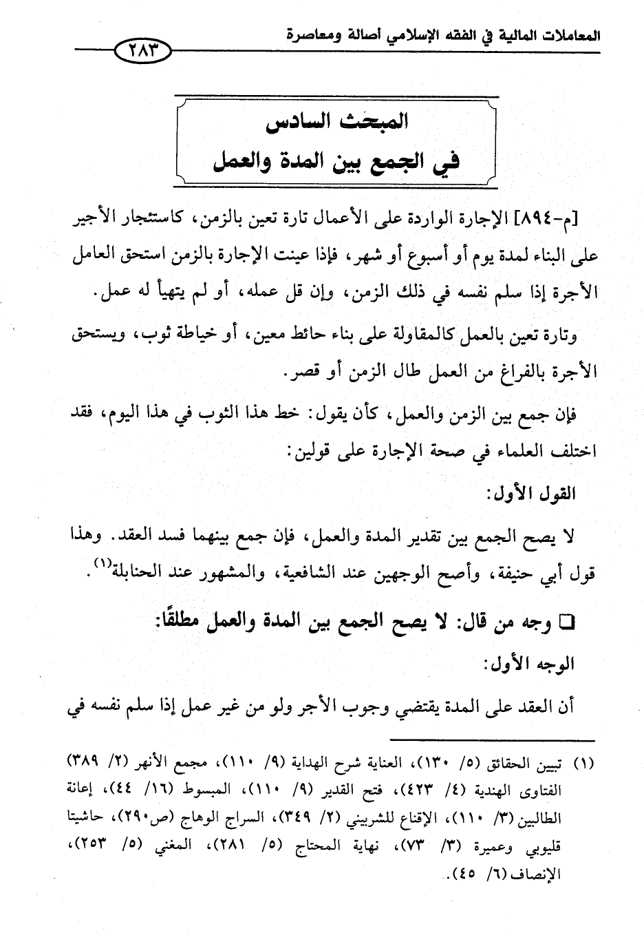 [م - ٨٩٤] الإجارة الواردة على الأعمال تارة تعين بالزمن، كاستئجار الأجير على البناء لمدة يوم أو أسبوع أو شهر، فإذا عينت الإجارة بالزمن استحق العامل الأجرة إذا سلم نفسه في ذلك الزمن، وإن قل عمله، أو لم يتهيأ له عمل.
