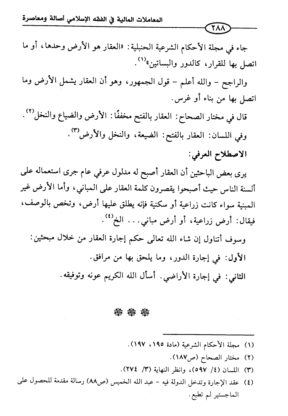 جاء في مجلة الأحكام الشرعية الحنبلية: "العقار هو الأرض وحدها، أو ما اتصل بها للقرار، كالدور والبساتين" (¬١).