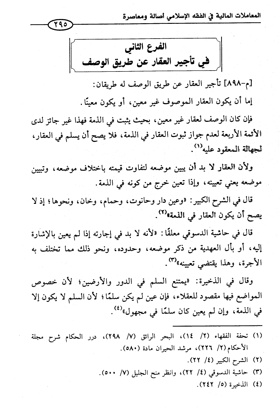 فإن كان الوصف لعقار غير معين، بحيث يثبت في الذمة فهذا غير جائز لدى الأئمة الأربعة لعدم جواز ثبوت العقار في الذمة، فلا يصح أن يسلم في العقار، لجهالة المعقود عليه (¬١).