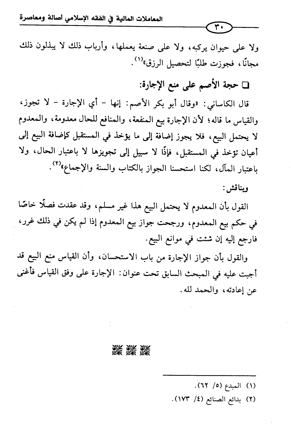 قال الكاساني: "وقال أبو بكر الأصم: إنها -أي الإجارة- لا تجوز، والقياس ما قاله؛ لأنّ الإجارة بيع المنفعة، والمنافع للحال معدومة، والمعدوم لا يحتمل البيع، فلا يجوز إضافة إلى ما يؤخذ في المستقبل كإضافة البيع إلى أعيان تؤخذ في المستقبل، فإذًا لا سبيل إلى تجويزها لا باعتبار الحال، ولا باعتبار المآل، لكنا استحسنا الجواز بالكتاب والسنة والإجماع" (¬٢).