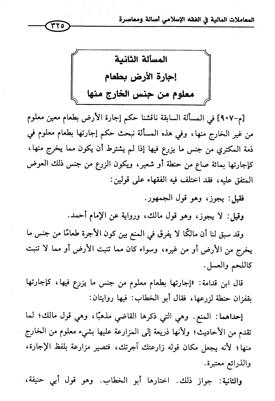 [م - ٩٠٧] في المسألة السابقة ناقشنا حكم إجارة الأرض بطعام معين معلوم من غير الخارج منها، وفي هذه المسألة نبحث حكم إجارتها بطعام معلوم في ذمة المكتري من جنس ما يزرع فيها إذا لم يشترط أن يكون مما يخرج منها، كإجارتها بمائة صاع من حنطة أو شعير، ويكون الزرع من جنس ذلك العوض المتفق عليه، فقد اختلف فيه الفقهاء على قولين: