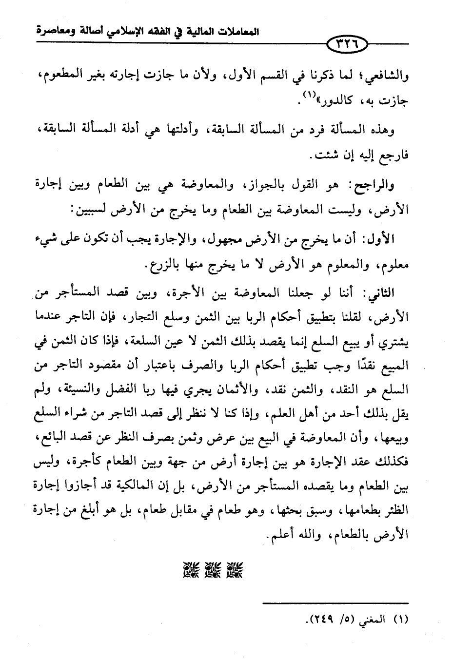 الثاني: أننا لو جعلنا المعاوضة بين الأجرة، وبين قصد المستأجر من الأرض، لقلنا بتطبيق أحكام الربا بين الثمن وسلع التجار، فإن التاجر عندما يشتري أو يبيع السلع إنما يقصد بذلك الثمن لا عين السلعة، فإذا كان الثمن في المبيع نقدًا وجب تطبيق أحكام الربا والصرف باعتبار أن مقصود التاجر من السلع هو النقد، والثمن نقد، والأثمان يجري فيها ربا الفضل والنسيئة، ولم يقل بذلك أحد من أهل العلم، وإذا كنا لا ننظر إلى قصد التاجر من شراء السلع وبيعها، وأن المعاوضة في البيع بين عرض وثمن بصرف النظر عن قصد البائع، فكذلك عقد الإجارة هو بين إجارة أرض من جهة وبين الطعام كأجرة، وليس بين الطعام وما يقصده المستأجر من الأرض، بل إن المالكية قد أجازوا إجارة الظئر بطعامها، وسبق بحثها، وهو طعام في مقابل طعام، بل هو أبلغ من إجارة الأرض بالطعام، والله أعلم.