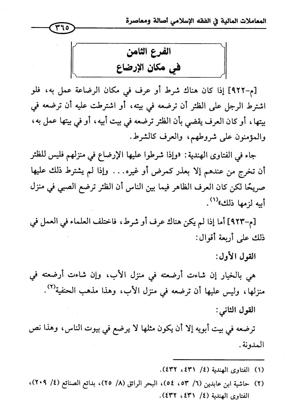 [م - ٩٢٢] إذا كان هناك شرط أو عرف في مكان الرضاعة عمل به، فلو اشترط الرجل على الظئر أن ترضعه في بيته، أو اشترطت عليه أن ترضعه في بيتها، أوكان العرف يقضي بأن الظئر ترضعه في بيت أبيه، أو في بيتها عمل به، والمؤمنون على شروطهم، والعرف كالشرط.