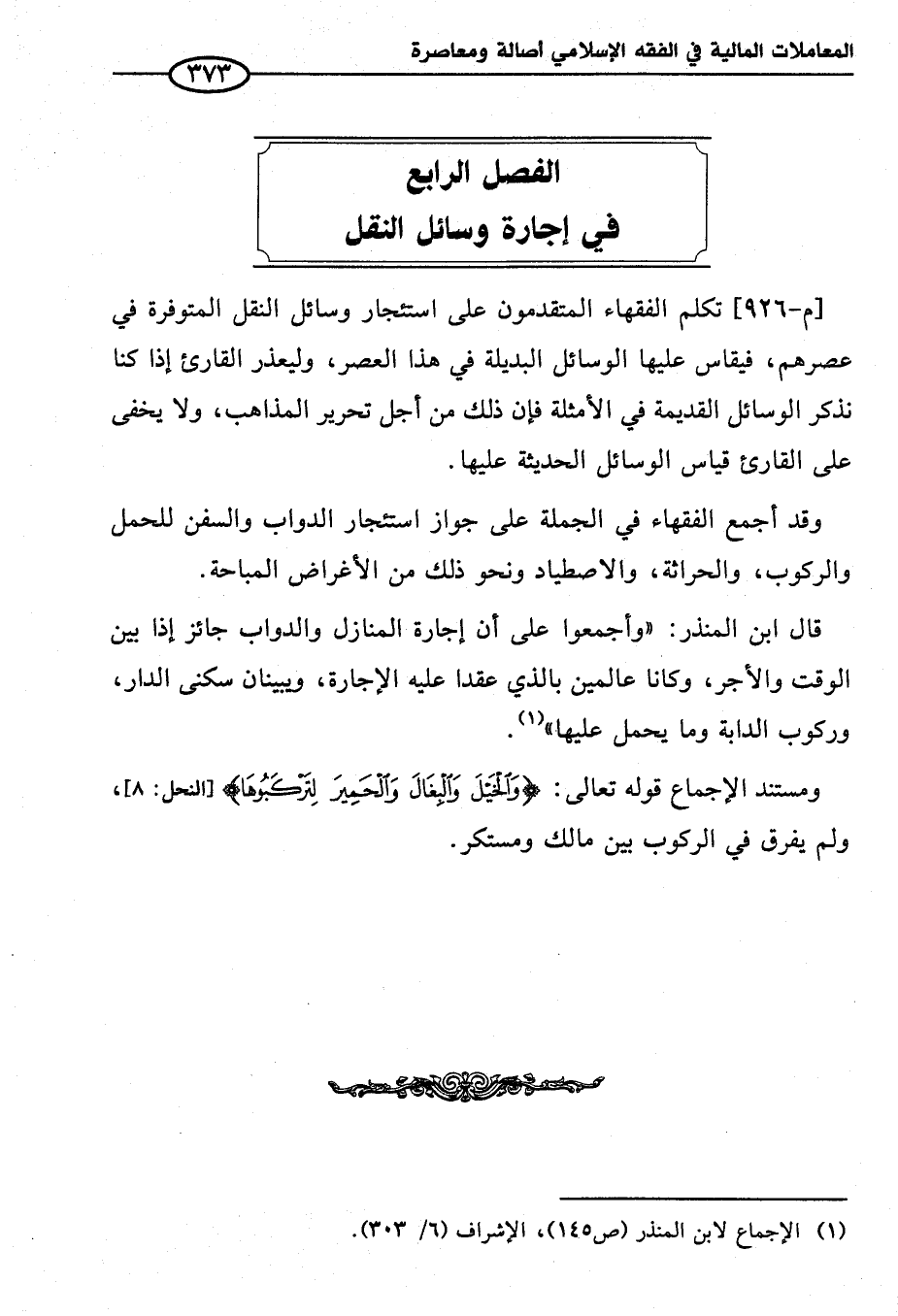 [م - ٩٢٦] تكلم الفقهاء المتقدمون على استئجار وسائل النقل المتوفرة في عصرهم، فيقاس عليها الوسائل البديلة في هذا العصر، وليعذر القارئ إذا كنا نذكر الوسائل القديمة في الأمثلة فإن ذلك من أجل تحرير المذاهب، ولا يخفى على القارئ قياس الوسائل الحديثة عليها.