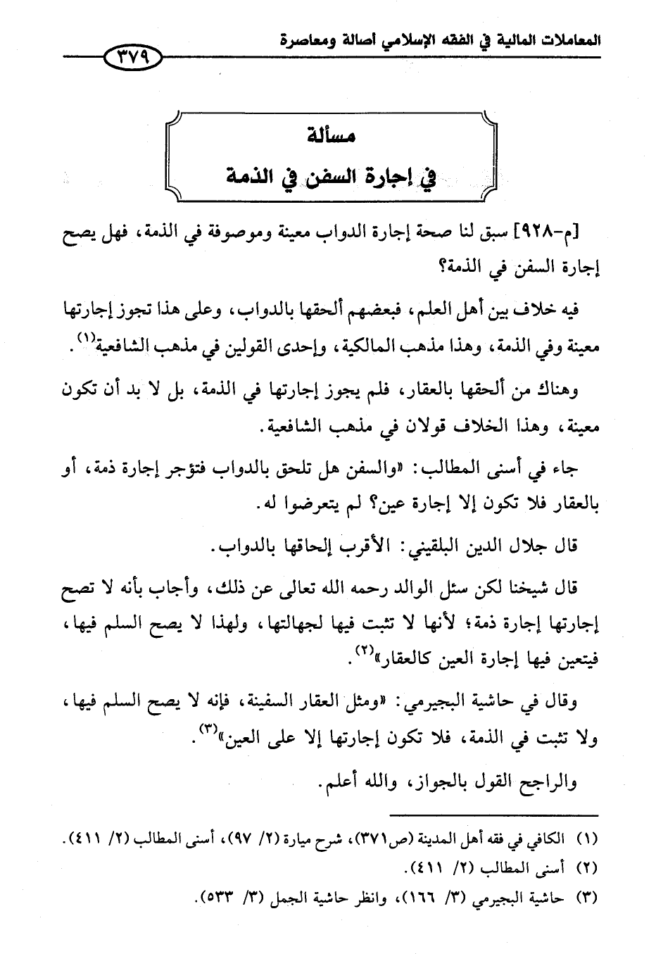 جاء في أسنى المطالب: "والسفن هل تلحق بالدواب فتؤجر إجارة ذمة، أو بالعقار فلا تكون إلا إجارة عين؟ لم يتعرضوا له.