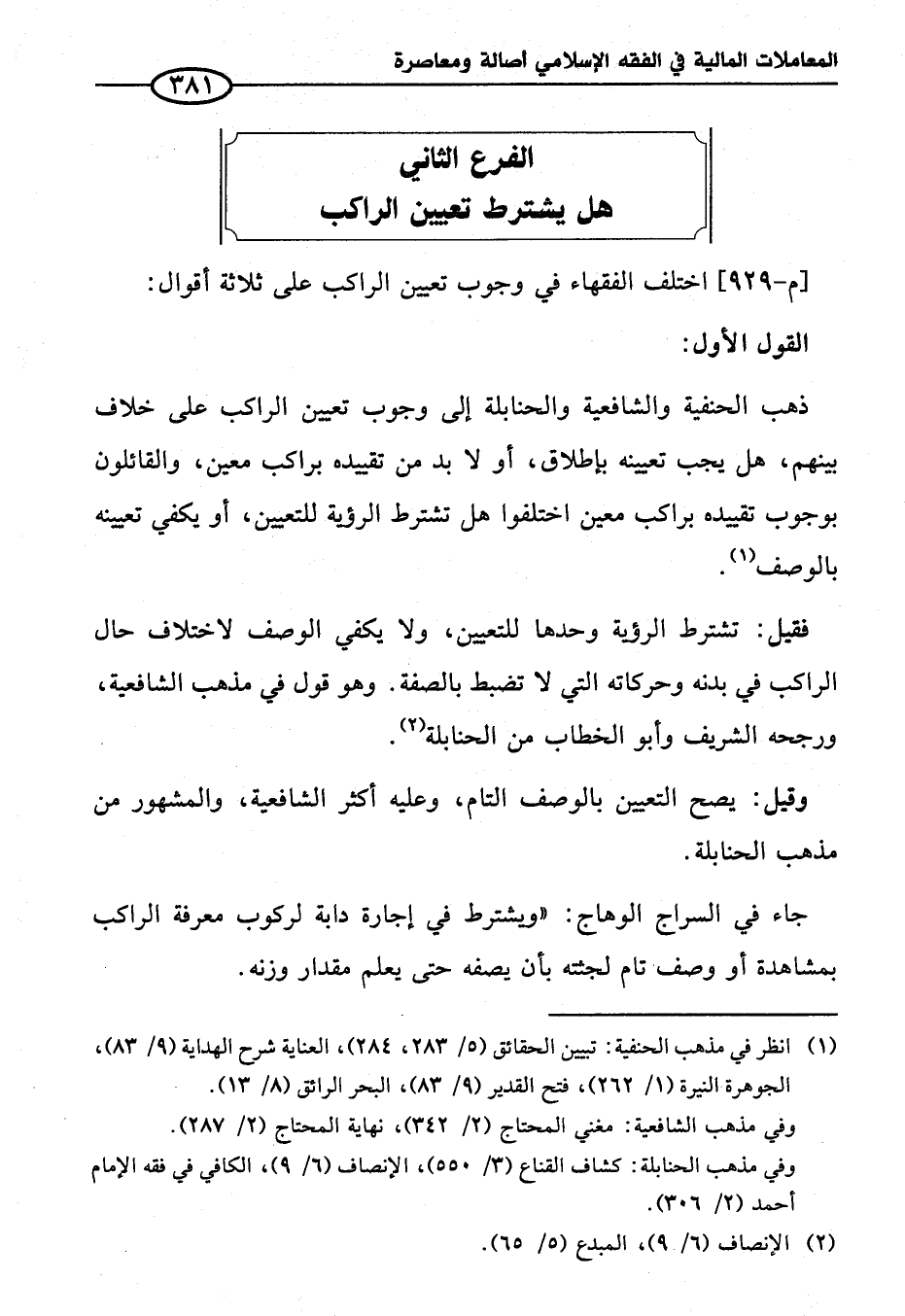 ذهب الحنفية والشافعية والحنابلة إلى وجوب تعيين الراكب على خلاف بينهم، هل يجب تعيينه بإطلاق، أو لا بد من تقييده براكب معين، والقائلون بوجوب تقييده براكب معين اختلفوا هل تشترط الرؤية للتعيين، أو يكفي تعيينه بالوصف (¬١).