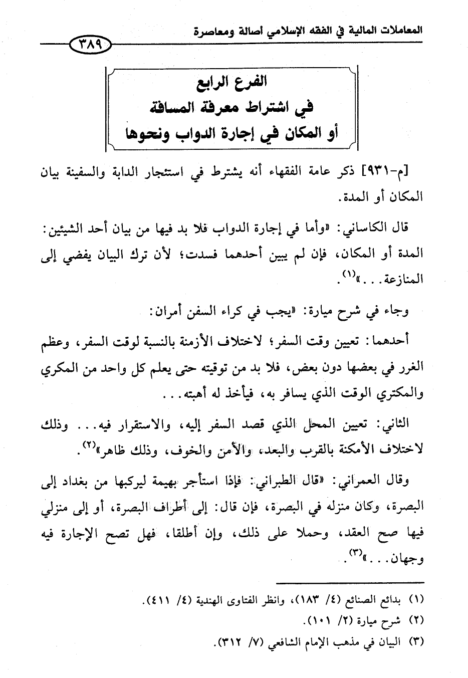 [م - ٩٣١] ذكر عامة الفقهاء أنه يشترط في استئجار الدابة والسفينة بيان المكان أو المدة.