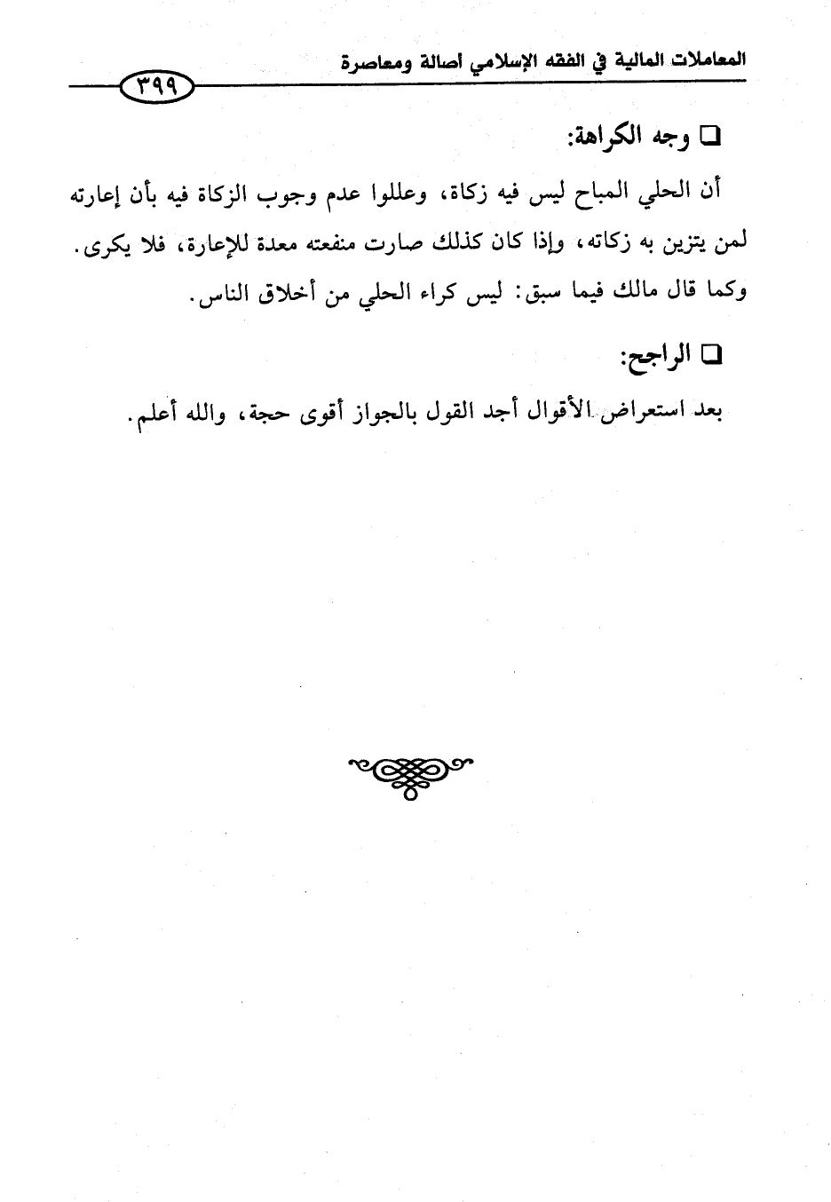 أن الحلي المباح ليس فيه زكاة، وعللوا عدم وجوب الزكاة فيه بأن إعارته لمن يتزين به زكاته، وإذا كان كذلك صارت منفعته معدة للإعارة، فلا يكرى. وكما قال مالك فيما سبق: ليس كراء الحلي من أخلاق الناس.