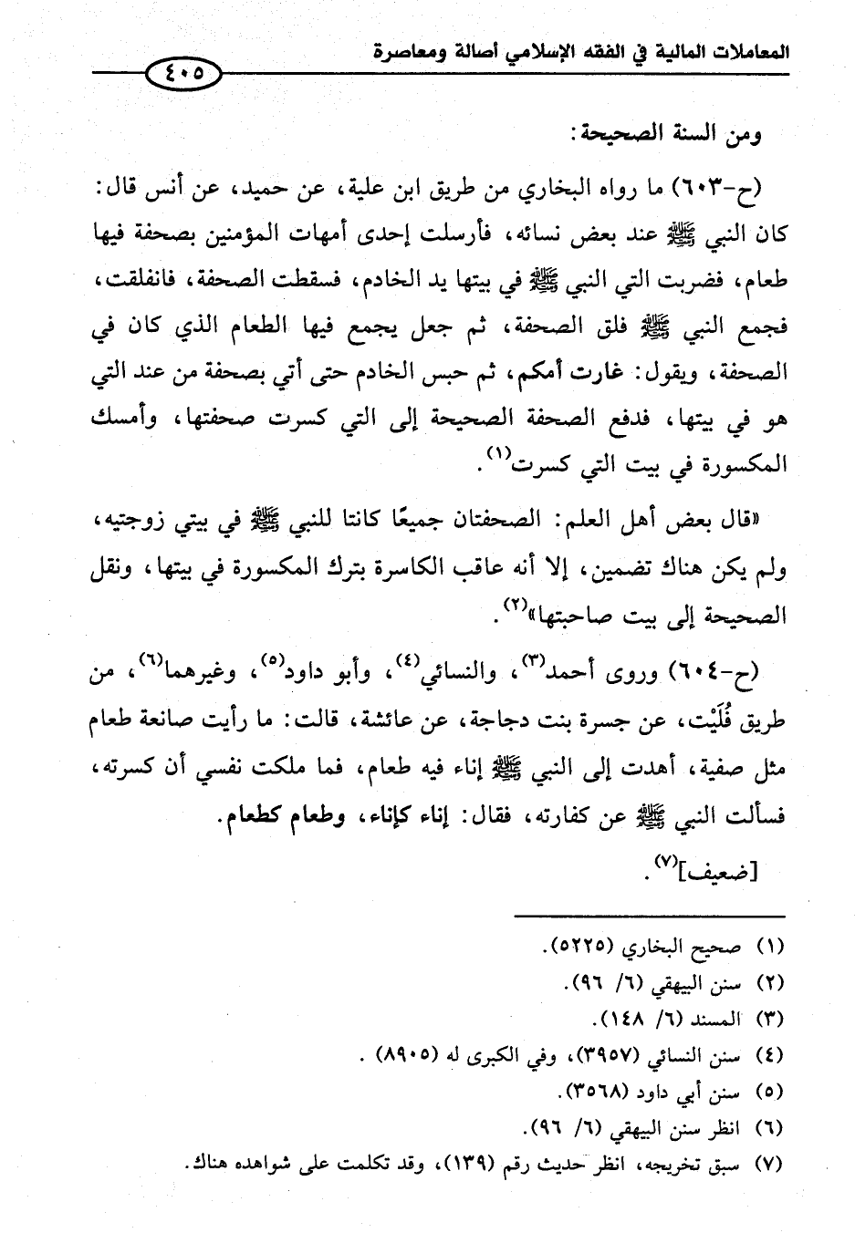 (ح-٦٠٣) ما رواه البخاري من طريق ابن علية، عن حميد، عن أنس قال: كان النبي - صلى الله عليه وسلم - عند بعض نسائه، فأرسلت إحدى أمهات المؤمنين بصحفة فيها طعام، فضربت التي النبي - صلى الله عليه وسلم - في بيتها يد الخادم، فسقطت الصحفة، فانفلقت، فجمع النبي - صلى الله عليه وسلم - فلق الصحفة، ثم جعل يجمع فيها الطعام الذي كان في الصحفة، ويقول: غارت أمكم، ثم حبس الخادم حتى أتي بصحفة من عند التي هو في بيتها، فدفع الصحفة الصحيحة إلى التي كسرت صحفتها، وأمسك المكسورة في بيت التي كسرت (¬١).