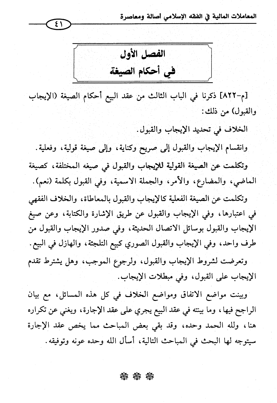 وتكلمت عن الصيغة الفعلية كالإيجاب والقبول بالمعاطاة، والخلاف الفقهي في اعتبارها، وفي الإيجاب والقبول عن طريق الإشارة والكتابة، وعن صيغ الإيجاب والقبول بوسائل الاتصال الحديثة، وفي صدور الإيجاب والقبول من طرف واحد، وفي الإيجاب والقبول الصوري كبيع التلجئة، والهازل في البيع.