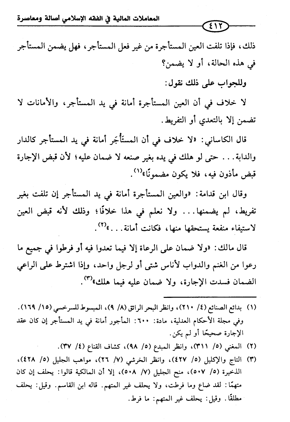(¬١) بدائع الصنائع (٤/ ٢١٠)، وانظر البحر الرائق (٨/ ٩)، المبسوط للسرخي (١٥/ ١٦٩). وفي مجلة الأحكام العدلية، مادة: ٦٠٠: المأجور أمانة في يد المستأجر إن كان عقد الإجارة صحيحًا أو لم يكن.