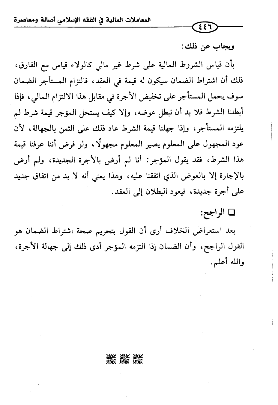 بأن قياس الشروط المالية على شرط غير مالي كالولاء قياس مع الفارق، ذلك أن اشتراط الضمان سيكون له قيمة في العقد، فالتزام المستأجر الضمان سوف يحمل المستأجر على تخفيض الأجرة في مقابل هذا الالتزام المالي، فإذا أبطلنا الشرط فلا بد أن نبطل عوضه، وإلا كيف يستحل المؤجر قيمة شرط لم يلتزمه المستأجر، وإذا جهلنا قيمة الشرط عاد ذلك على الثمن بالجهالة؛ لأن عود المجهول على المعلوم يصير المعلوم مجهولًا, ولو فرض أننا عرفنا قيمة هذا الشرط، فقد يقول المؤجر: أنا لم أرض بالأجرة الجديدة، ولم أرض بالإجارة إلا بالعوض الذي اتفقنا عليه، وهذا يعني أنه لا بد من اتفاق جديد على أجرة جديدة، فيعود البطلان إلى العقد.