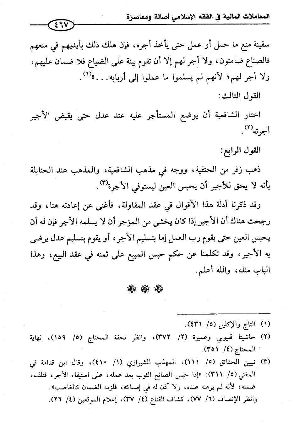 (¬٣) تبيين الحقائق (٥/ ١١١)، المهذب للشيرازي (١/ ٤١٠)، وقال ابن قدامة في المغني (٥/ ٣١١): "إذا حبس الصانع الثوب بعد عمله، على استيفاء الأجر، فتلف، ضمنه؛ لأنه لم يرهنه عنده، ولا أذن له في إمساكه، فلزمه الضمان كالغاصب".