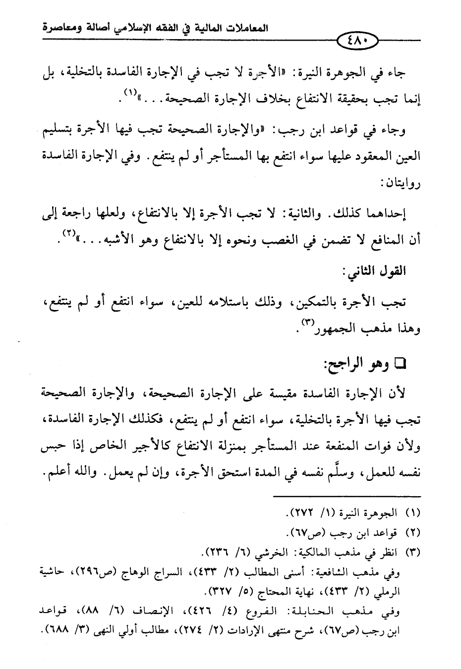وجاء في قواعد ابن رجب: "والإجارة الصحيحة تجب فيها الأجرة بتسليم العين المعقود عليها سواء انتفع بها المستأجر أو لم ينتفع. وفي الإجارة الفاسدة روايتان: