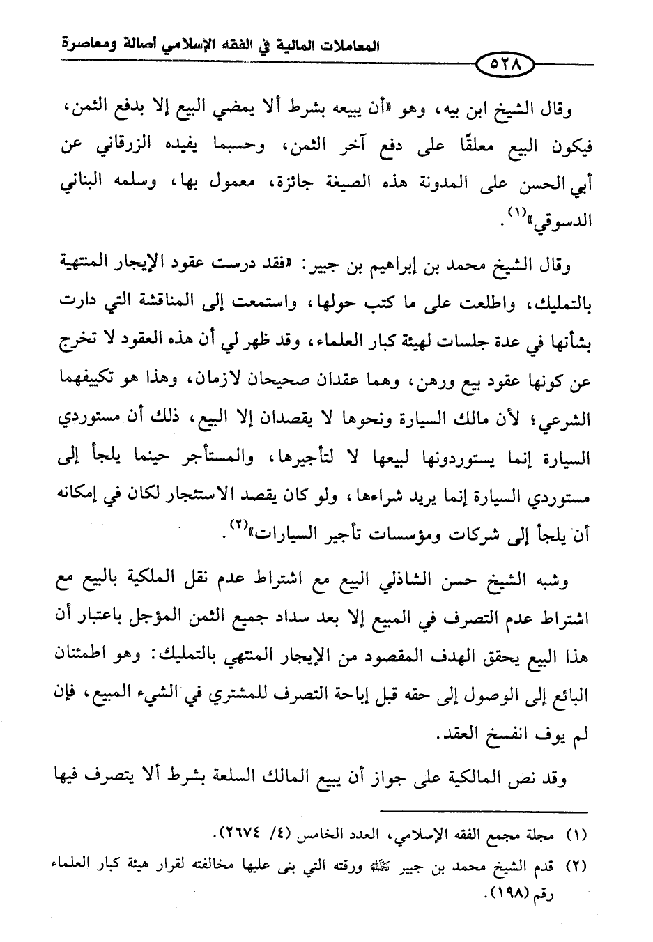 وقال الشيخ محمَّد بن إبراهيم بن جبير: "فقد دريست عقود الإيجار المنتهية بالتمليك، واطلعت على ما كتب حولها، واستمعت إلى المناقشة التي دارت بشأنها في عدة جلسات لهيئة كبار العلماء، وقد ظهر لي أن هذه العقود لا تخرج عن كونها عقود بيع ورهن، وهما عقدان صحيحان لازمان، وهذا هو تكييفهما الشرعي؛ لأن مالك السيارة ونحوها لا يقصدان إلا البيع، ذلك أن مستوردي السيارة إنما يستوردونها لبيعها لا لتأجيرها، والمستأجر حينما يلجأ إلى مستوردي السيارة إنما يريد شراءها، ولو كان يقصد الاستئجار لكان في إمكانه أن يلجأ إلى شركات ومؤسسات تأجير السيارات" (¬٢).