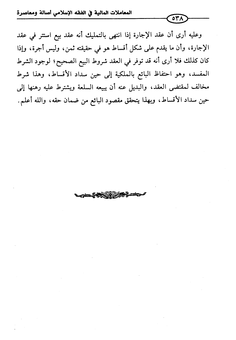 وعليه أرى أن عقد الإجارة إذا انتهى بالتمليك أنه عقد بيع استتر في عقد الإجارة، وأن ما يقدم على شكل أقساط هو في حقيقته ثمن، وليس أجرة، وإذا كان كذلك فلا أرى أنه قد توفر في العقد شروط البيع الصحيح؛ لوجود الشرط المفسد، وهو احتفاظ البائع بالملكية إلى حين سداد الأقساط، وهذا شرط مخالف لمقتضى العقد، والبديل عنه أن يبيعه السلعة ويشترط عليه رهنها إلى حين سداد الأقساط، وبهذا يتحقق مقصود البائع من ضمان حقه، والله أعلم.