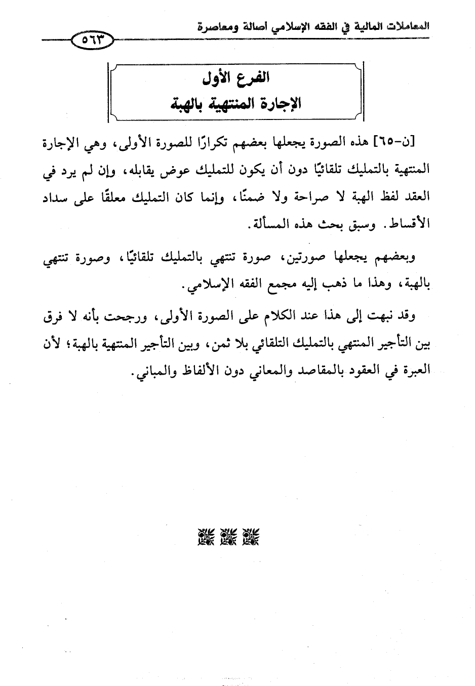[ن-٦٥] هذه الصورة يجعلها بعضهم تكرارًا للصورة الأولى، وهي الإجارة المنتهية بالتمليك تلقائيا دون أن يكون للتمليك عوض يقابله، وإن لم يرد في العقد لفظ الهبة لا صراحة ولا ضمنا، وإنما كان التمليك معلقًا على سداد الأقساط. وسبق بحث هذه المسألة.