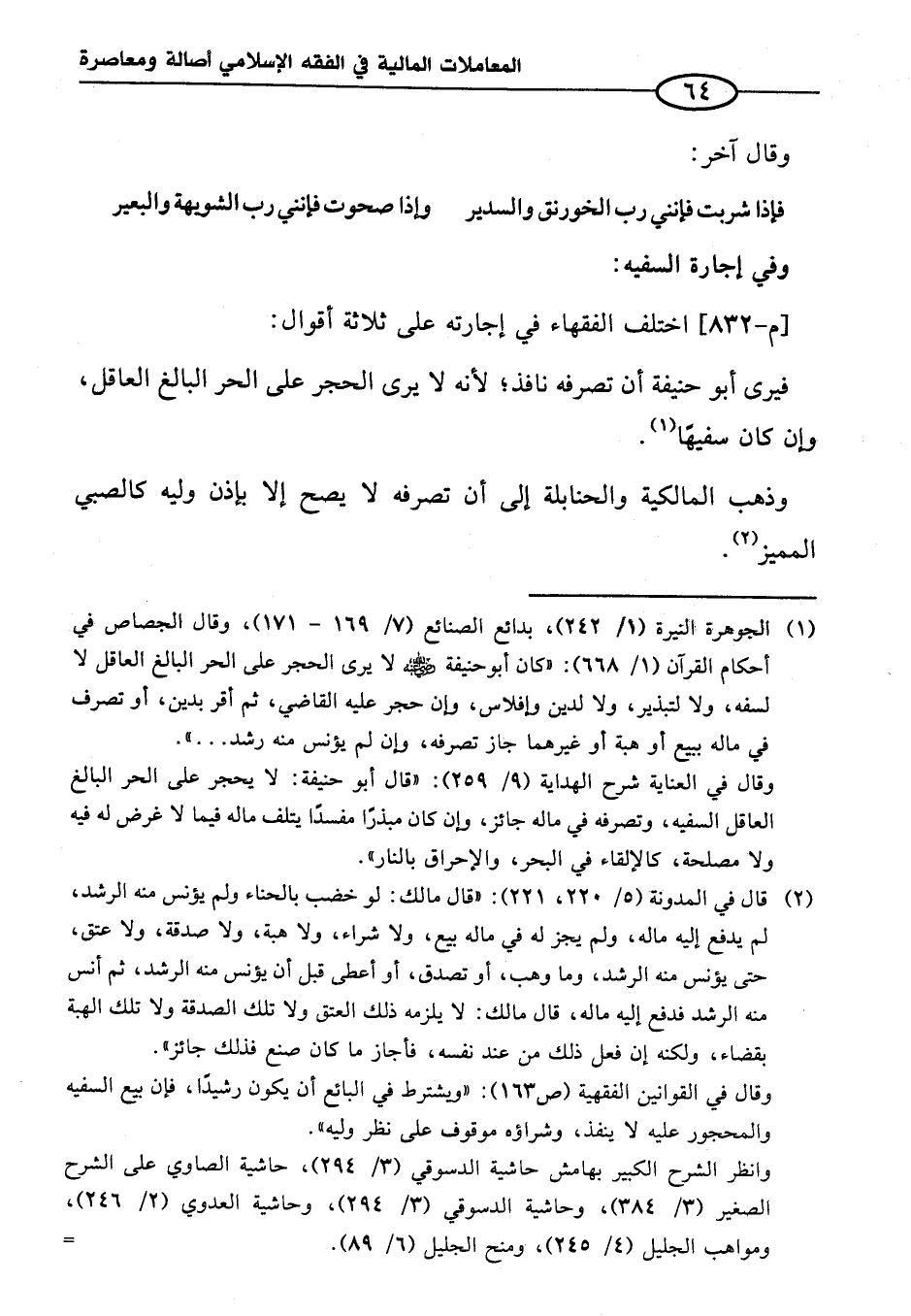 وقال في العناية شرح الهداية (٩/ ٢٥٩): "قال أبو حنيفة: لا يحجر على الحر البالغ العاقل السفيه، وتصرفه في ماله جائز، وإن كان مبذراً مفسداً يتلف ماله فيما لا غرض له فيه ولا مصلحة، كالإلقاء في البحر، والإحراق بالنار".