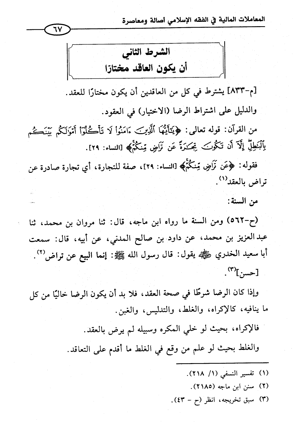 والدليل على اشتراط الرضا (الاختيار) في العقود.